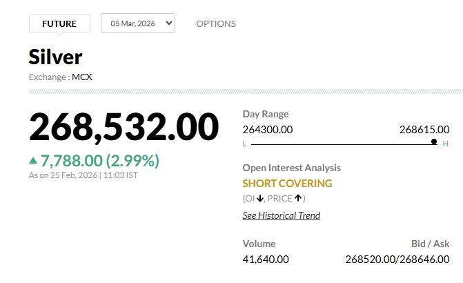ਚਾਂਦੀ ਦੀਆਂ ਕੀਮਤਾਂ ਵਿੱਚ ਵੀ ਕਾਫ਼ੀ ਵਾਧਾ ਦੇਖਣ ਨੂੰ ਮਿਲਿਆ। 5 ਮਾਰਚ ਨੂੰ ਡਿਲੀਵਰੀ ਲਈ ਚਾਂਦੀ ਸਵੇਰੇ 9:21 ਵਜੇ ਤੱਕ ₹6,004.00 (2.30%) ਵੱਧ ਕੇ ₹2,66,748.00 'ਤੇ ਵਪਾਰ ਕਰ ਰਹੀ ਸੀ। ਮੁੰਬਈ ਵਿੱਚ ਚਾਂਦੀ ਦੀ ਕੀਮਤ ₹2,60,840 ਪ੍ਰਤੀ ਕਿਲੋਗ੍ਰਾਮ ਤੱਕ ਪਹੁੰਚ ਗਈ ਹੈ। ਦਿੱਲੀ ਵਿੱਚ ਵੀ ਚਾਂਦੀ ₹2,60,390 'ਤੇ ਕਾਰੋਬਾਰ ਕਰ ਰਹੀ ਹੈ।