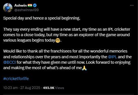 ਅਸ਼ਵਿਨ ਨੇ ਆਪਣੀ ਆਈਪੀਐਲ ਰਿਟਾਇਰਮੈਂਟ ਪੋਸਟ ਵਿੱਚ ਕੀ ਲਿਖਿਆ?