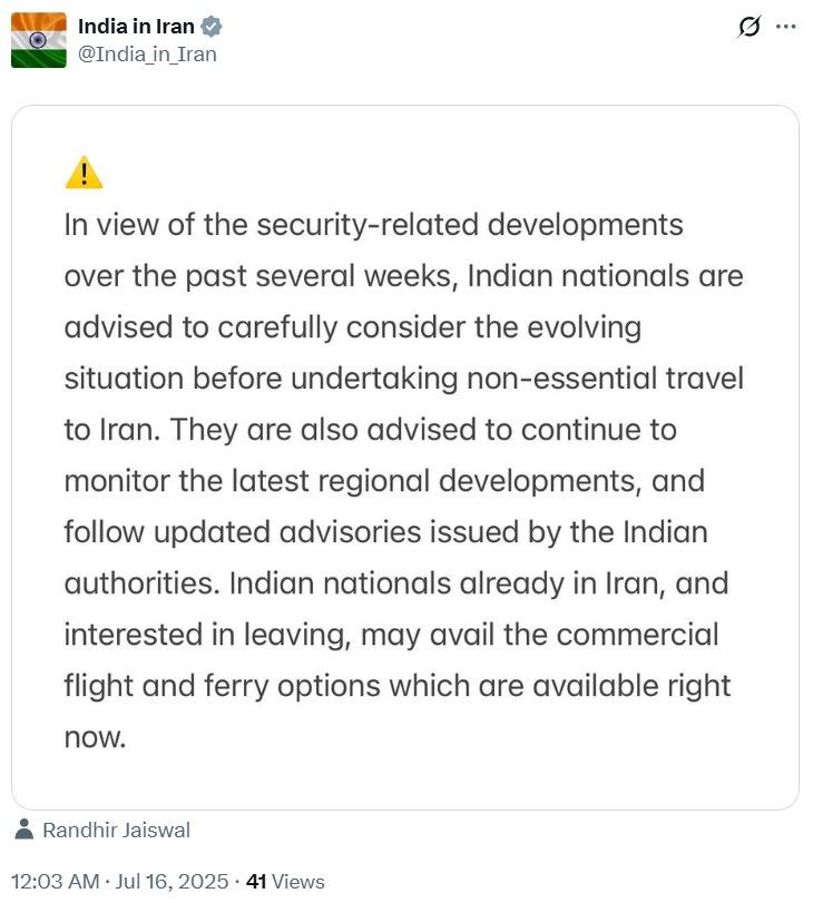 ਦੂਤਾਵਾਸ ਨੇ ਅੱਗੇ ਲਿਖਿਆ, "ਭਾਰਤੀ ਨਾਗਰਿਕ ਜੋ ਪਹਿਲਾਂ ਹੀ ਈਰਾਨ ਵਿੱਚ ਹਨ ਅਤੇ ਜਾਣਾ ਚਾਹੁੰਦੇ ਹਨ, ਉਹ ਵਰਤਮਾਨ ਵਿੱਚ ਉਪਲਬਧ ਵਪਾਰਕ ਉਡਾਣ ਅਤੇ ਫੈਰੀ ਸੇਵਾਵਾਂ ਦਾ ਲਾਭ ਲੈ ਸਕਦੇ ਹਨ।"