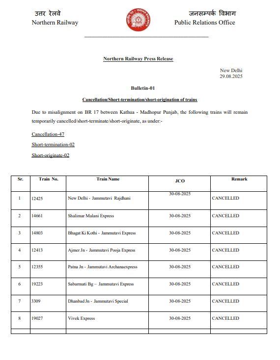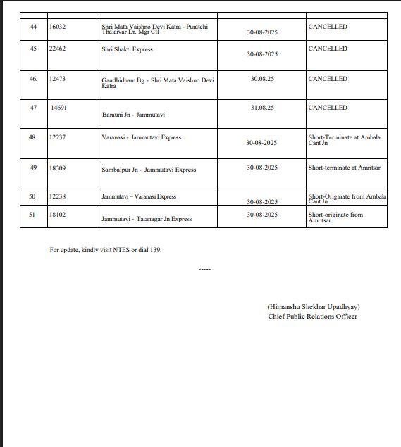 ਇਸ ਤੋਂ ਇਲਾਵਾ ਕਾਲਕਾ ਸ਼੍ਰੀ ਮਾਤਾ ਵੈਸ਼ਨੋ ਦੇਵੀ ਕਟੜਾ, ਰਿਸ਼ੀਕੇਸ਼ ਸ਼੍ਰੀ ਮਾਤਾ ਵੈਸ਼ਨੋ ਦੇਵੀ ਕਟੜਾ, ਨਵੀਂ ਦਿੱਲੀ ਸ਼੍ਰੀ ਮਾਤਾ ਵੈਸ਼ਨੋ ਦੇਵੀ ਕਟੜਾ, ਸੂਬੇਦਾਰਗੰਜ ਸ਼੍ਰੀ ਮਾਤਾ ਵੈਸ਼ਨੋ ਦੇਵੀ ਕਟੜਾ, ਗਾਜ਼ੀਪੁਰ ਸਿਟੀ ਸ਼੍ਰੀ ਮਾਤਾ ਵੈਸ਼ਨੋ ਦੇਵੀ ਕਟੜਾ, ਗਾਜ਼ੀਪੁਰ ਸਿਟੀ 1 ਸ਼੍ਰੀ ਮਾਤਾ ਵੈਸ਼ਨੋ ਦੇਵੀ ਕਟੜਾ, ਸ਼੍ਰੀ ਅੰਬੇਦਰੀ ਸ਼੍ਰੀ ਕਾਂਤਰਾ ਸ਼੍ਰੀ ਮਮਤਾਰੀ ਕਟਰਾ, ਡਾ. ਵੈਸ਼ਨੋ ਦੇਵੀ ਕਟੜਾ, ਜੰਮੂ ਤਵੀ-ਬਰੌਨੀ ਜੰਕਸ਼ਨ ਰੱਦ ਕਰ ਦਿੱਤੀ ਹੈ।
