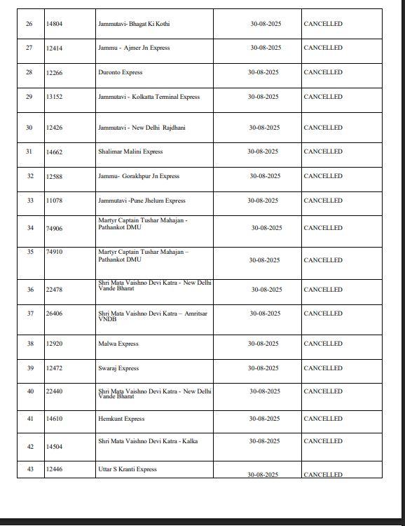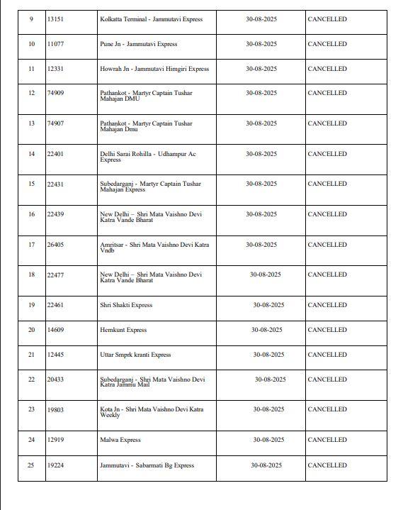 ਪ੍ਰਾਪਤ ਜਾਣਕਾਰੀ ਅਨੁਸਾਰ ਰੱਦ ਕੀਤੀਆਂ ਗਈਆਂ ਰੇਲਗੱਡੀਆਂ ਵਿੱਚ ਸ਼ਾਲੀਮਾਰ ਮਲਾਨੀ ਐਕਸਪ੍ਰੈਸ, ਭਗਤ ਕੀ ਕੋਠੀ - ਜੰਮੂਤਬੀ ਐਕਸਪ੍ਰੈਸ, ਅਜਮੇਰ ਜੰਕਸ਼ਨ - ਜੰਮੂਤਵੀ ਪੂਜਾ ਐਕਸਪ੍ਰੈਸ, ਪਟਨਾ ਜੰਕਸ਼ਨ - ਜੰਮੂਤਵੀ ਅਰਚਨਾ ਐਕਸਪ੍ਰੈਸ, ਸਾਬਰਮਤੀ BG - ਜੰਮੂਤਵੀ ਐਕਸਪ੍ਰੈਸ , ਧਨਬਾਦ ਜੰ: ਜੰਮੂ ਤਵੀ ਸਪੈਸ਼ਲ ,ਵਿਵੇਕ ਐਕਸਪ੍ਰੈਸ ,ਕੋਲਕਾਤਾ ਟਰਮੀਨਲ - ਜੰਮੂਤਵੀ ਐਕਸਪ੍ਰੈਸ , ਨਵੀਂ ਦਿੱਲੀ ਸ਼੍ਰੀ ਮਾਤਾ ਵੈਸ਼ਨੋ ਦੇਵੀ ਕਟੜਾ ,ਅੰਮ੍ਰਿਤਸਰ - ਸ਼੍ਰੀ ਮਾਤਾ ਵੈਸ਼ਨੋ ਦੇਵੀ ਕਟੜਾ ਸ਼ਾਮਲ ਹਨ।