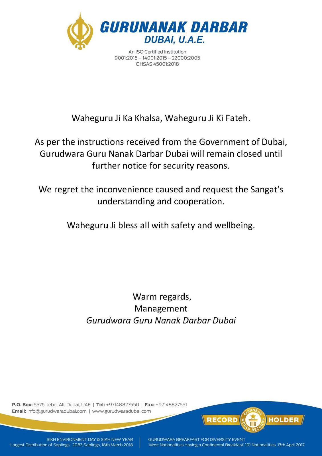 ਸ਼ਰਧਾਲੂਆਂ ਲਈ ਇੱਕ ਜਾਰੀ ਬਿਆਨ ਵਿੱਚ ਕਿਹਾ ਗਿਆ ਹੈ ਕਿ ਸੁਰੱਖਿਆ ਕਾਰਨਾਂ ਦੇ ਚਲਦਿਆਂ ਗੁਰਦੁਆਰਾ ਸਾਹਿਬ ਅਤੇ ਹਿੰਦੂ ਮੰਦਰ ਨੂੰ ਅਗਲੀ ਸੂਚਨਾ ਤੱਕ ਬੰਦ ਕੀਤਾ ਗਿਆ ਹੈ। ਪ੍ਰਬੰਧਕਾਂ ਨੇ ਇਸ ਲਈ ਮਾਫੀ ਮੰਗੀ ਹੈ ਅਤੇ ਸ਼ਰਧਾਲੂਆਂ ਤੋਂ ਸਹਿਯੋਗ ਦੀ ਅਪੀਲ ਕੀਤੀ। ਉਨ੍ਹਾਂ ਨਾਲ ਹੀ ਸਾਰੇ ਸ਼ਰਧਾਲੂਆਂ ਦੀ ਸੁਰੱਖਿਆ ਲਈ ਵੀ ਅਰਦਾਸ ਕੀਤੀ।