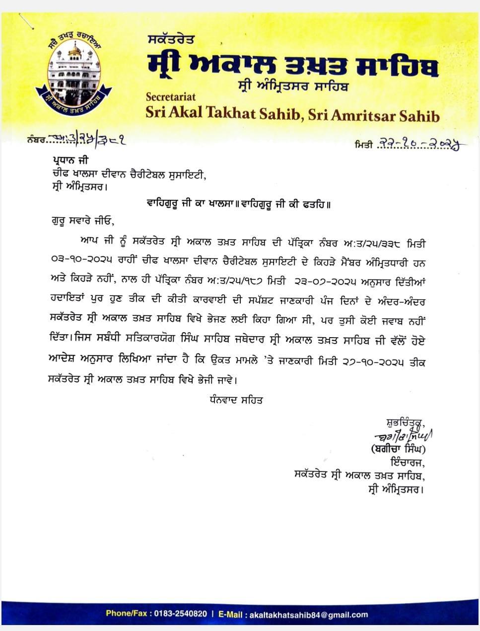 ਦੱਸ ਦੇਈਏ ਕਿ ਚੀਫ ਖਾਲਸਾ ਦੀਵਾਨ ਦੇ ਪ੍ਰਬੰਧ 'ਤੇ ਅਹੁਦੇਦਾਰਾਂ ਖ਼ਿਲਾਫ਼ ਮਿਲੀਆਂ ਲਿਖਤੀ ਸ਼ਿਕਾਇਤਾਂ ਨੂੰ ਧਿਆਨ ਵਿੱਚ ਰੱਖਦਿਆਂ ਸ੍ਰੀ ਅਕਾਲ ਤਖਤ ਸਾਹਿਬ ਵੱਲੋਂ ਚੀਫ ਖਾਲਸਾ ਦੀਵਾਨ ਦੇ ਪ੍ਰਧਾਨ ਨੂੰ ਇੱਕ ਅਹਿਮ ਪੱਤਰ ਭੇਜਿਆ ਗਿਆ ਸੀ। ਇਸ ਪੱਤਰ ਰਾਹੀਂ ਅਕਾਲ ਤਖਤ ਸਾਹਿਬ ਨੇ ਚੀਫ ਖਾਲਸਾ ਦੀਵਾਨ ਦੀ ਸਮੁੱਚੀ ਕਾਰਜਕਾਰਨੀ ਕਮੇਟੀ ਨੂੰ ਹੁਕਮ ਦਿੱਤਾ ਸੀ ਕਿ ਉਹ ਸਕੱਤਰੇਤ ਅਕਾਲ ਤਖ਼ਤ ਸਾਹਿਬ ਪਹੁੰਚ ਕੇ ਆਪਣਾ ਪੱਖ ਰੱਖਣ।