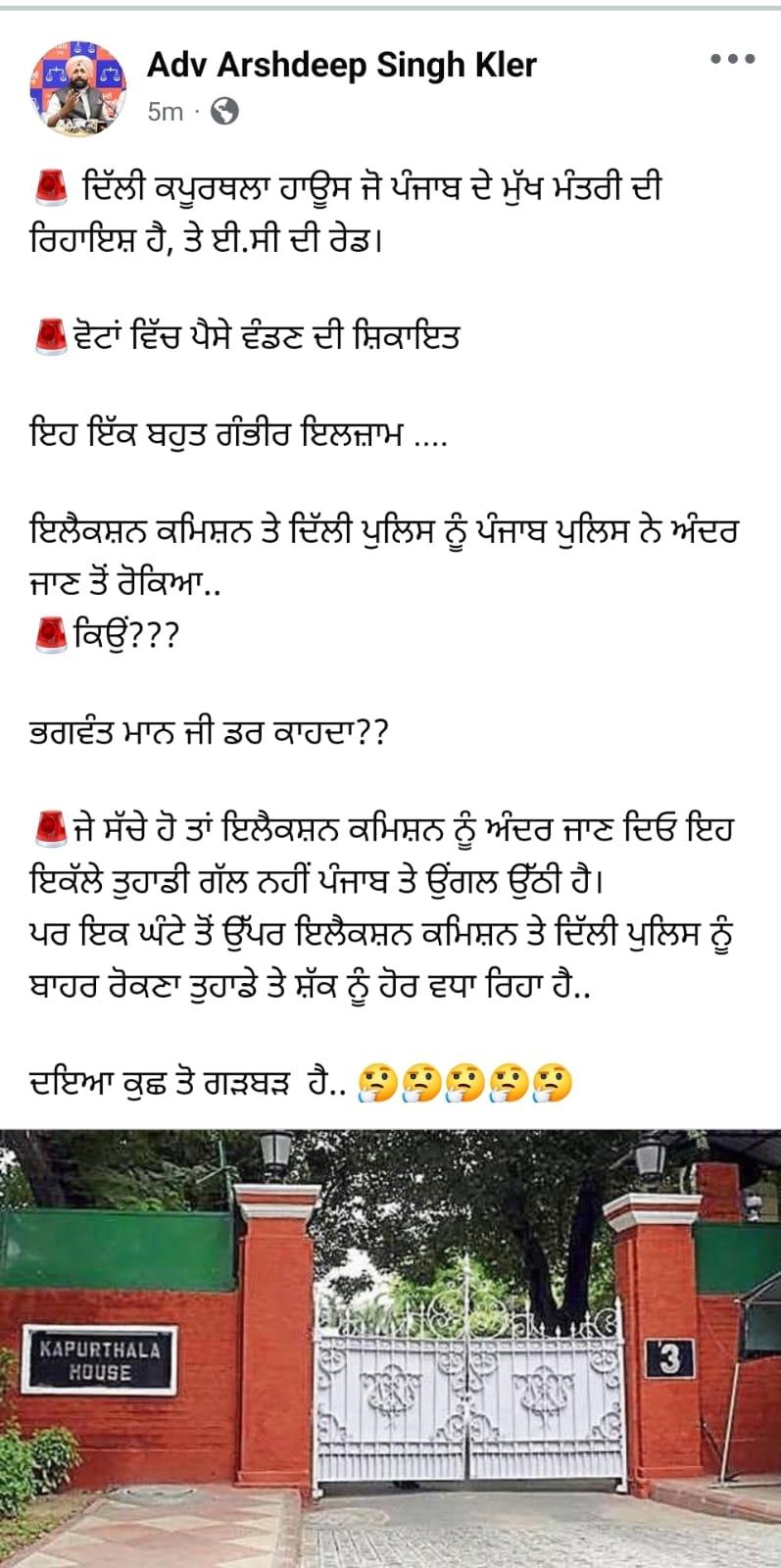 ਸ਼੍ਰੋਮਣੀ ਅਕਾਲੀ ਦਲ ਦੇ ਬੁਲਾਰੇ ਐਡਵੋਕੇਟ ਅਰਸ਼ਦੀਪ ਸਿੰਘ ਨੇ ਕਿਹਾ ਕਿ ਸੀਐਮ ਮਾਨ ਦੀ ਰਿਹਾਇਸ਼ 'ਤੇ ਕਪੂਰਥਲਾ ਹਾਊਸ 'ਤੇ ਪੈਸੇ ਵੰਡਣ ਦੇ ਸਬੰਧ 'ਚ ਇਲੈਕਸ਼ਨ ਕਮਿਸ਼ਨ ਦੀ ਰੇਡ, ਇਹ ਇੱਕ ਬਹੁਤ ਹੀ ਗੰਭੀਰ ਇਲਜ਼ਾਮ ਹੈ। ਉਨ੍ਹਾਂ ਕਿਹਾ ਕਿ ਟੀਮ ਨੂੰ ਰਿਹਾਇਸ਼ ਅੰਦਰ ਜਾਣ ਤੋਂ ਰੋਕਿਆ ਕਿਉਂ ਗਿਆ?
