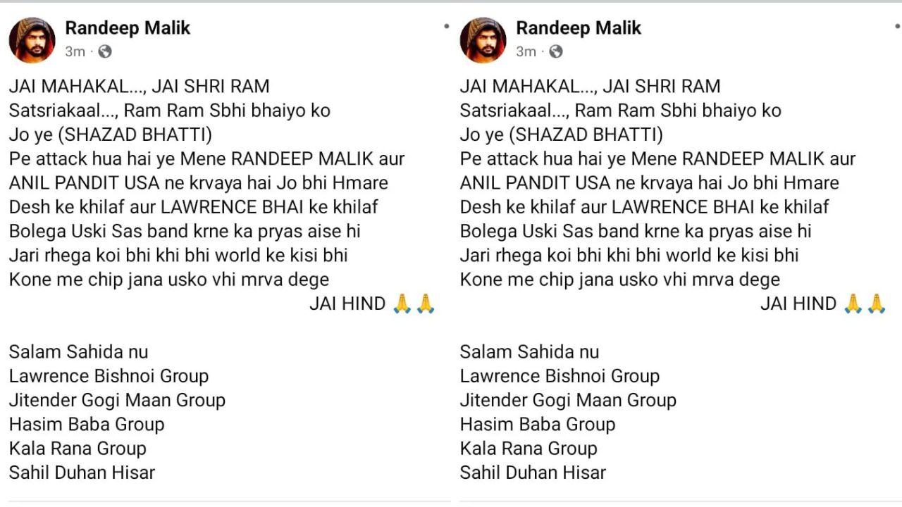 ਰਣਦੀਪ ਮਲਿਕ ਨਾਮ ਹੇਠ ਇੱਕ ਸੋਸ਼ਲ ਮੀਡੀਆ ਅਕਾਊਂਟ ਦੀ ਪੋਸਟ 'ਚ ਦਾਅਵਾ ਕੀਤਾ ਗਿਆ ਹੈ, "ਸ਼ਹਿਜ਼ਾਦ ਭੱਟੀ 'ਤੇ ਇਹ ਹਮਲਾ ਮੇਰੇ ਰਣਦੀਪ ਮਲਿਕ ਅਤੇ ਅਨਿਲ ਪੰਡਿਤ (ਅਮਰੀਕਾ) ਵੱਲੋਂ ਕਰਵਾਇਆ ਗਿਆ ਹੈ, ਜਿਹੜਾ ਵੀ ਸਾਡੇ ਦੇਸ਼ ਅਤੇ ਭਾਈ ਲਾਰੈਂਸ ਦੇ ਵਿਰੁੱਧ ਬੋਲੇ, ਉਸ ਦੀ ਆਵਾਜ਼ ਇਸ ਤਰ੍ਹਾਂ ਹੀ ਬੰਦ ਕਰਵਾਉਣ ਦੀਆਂ ਕੋਸ਼ਿਸ਼ਾਂ ਜਾਰੀ ਰਹਿਣਗੀਆਂ। ਕੋਈ ਵੀ ਕਿਤੇ ਵੀ ਤੇ ਦੁਨੀਆ ਦੇ ਕਿਸੇ ਵੀ ਕੋਨੇ 'ਚ ਲੁਕ ਜਾਵੇ, ਉਸ ਨੂੰ ਵੀ ਮਰਵਾ ਦੇਵਾਂਗੇ।''