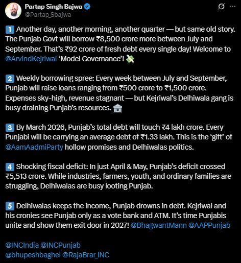 ਬਾਜਵਾ ਨੇ ਇਲਜ਼ਾਮ ਲਗਾਇਆ ਕਿ ਜੁਲਾਈ ਤੋਂ ਸਤੰਬਰ 2025 ਦੇ ਵਿਚਕਾਰ, ਪੰਜਾਬ ਸਰਕਾਰ ₹ 8,500 ਕਰੋੜ ਦਾ ਨਵਾਂ ਕਰਜ਼ਾ ਲਵੇਗੀ। ਇਸ ਦਾ ਮਤਲਬ ਹੈ ਕਿ ਰਾਜ ਹਰ ਰੋਜ਼ ਔਸਤਨ ₹ 92 ਕਰੋੜ ਦਾ ਨਵਾਂ ਕਰਜ਼ਾ ਜੋੜੇਗਾ। ਉਨ੍ਹਾਂ ਇਸ ਸਥਿਤੀ ਨੂੰ ਅਰਵਿੰਦ ਕੇਜਰੀਵਾਲ ਦੇ "ਮਾਡਲ ਗਵਰਨੈਂਸ" ਦੀ ਅਸਫਲਤਾ ਦੱਸਿਆ।