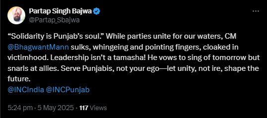 ਪੰਜਾਬ ਟਰਮੀਨੇਸ਼ਨ ਆਫ਼ ਐਗਰੀਮੈਂਟਸ ਐਕਟ, 2004 ਤੋਂ ਪ੍ਰੇਰਨਾ ਲੈ ਕੇ, ਜੋ ਕਾਂਗਰਸ ਦੀ ਅਗਵਾਈ ਵਾਲੀ ਸਰਕਾਰ ਅਧੀਨ ਪੰਜਾਬ ਦੇ ਦਰਿਆਈ ਪਾਣੀਆਂ 'ਤੇ ਅਧਿਕਾਰ ਜਤਾਉਣ ਲਈ ਲਾਗੂ ਕੀਤਾ ਗਿਆ ਸੀ, ਬਾਜਵਾ ਨੇ 'ਆਪ' ਸਰਕਾਰ ਨੂੰ ਵੀ ਇਸੇ ਤਰ੍ਹਾਂ ਦਾ ਦ੍ਰਿੜ ਰੁਖ਼ ਅਪਣਾਉਣ ਦਾ ਸੱਦਾ ਦਿੱਤਾ। "ਪੰਜਾਬ ਦਾ ਪਾਣੀ ਸਿਰਫ਼ ਇੱਕ ਸਰੋਤ ਨਹੀਂ ਹੈ - ਇਹ ਸਾਡੀ ਜ਼ਮੀਨ, ਸਾਡੇ ਕਿਸਾਨਾਂ ਅਤੇ ਸਾਡੀ ਪਛਾਣ ਦਾ ਜੀਵਨ ਖੂਨ ਹੈ।”