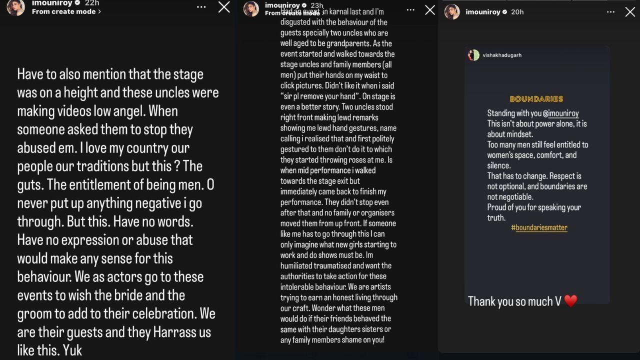 ਮੌਨੀ ਰਾਏ ਨੇ ਆਪਣੀ ਇੰਸਟਾਗ੍ਰਾਮ ਕਹਾਣੀ 'ਤੇ ਇੱਕ ਲੰਮਾ, ਵਿਸਤ੍ਰਿਤ ਨੋਟ ਸਾਂਝਾ ਕੀਤਾ। ਨੋਟ ਵਿੱਚ ਉਨ੍ਹਾਂ ਨੇ ਲਿਖਿਆ ਕਿ ਕਿਵੇਂ ਦਰਸ਼ਕਾਂ ਵਿੱਚ ਮੌਜੂਦ ਲੋਕਾਂ, ਜਿਨ੍ਹਾਂ ਵਿੱਚ ਬਜ਼ੁਰਗ ਆਦਮੀ ਵੀ ਸ਼ਾਮਲ ਸਨ, ਨੇ ਕਥਿਤ ਤੌਰ 'ਤੇ ਉਸ ਨਾਲ ਬਦਸਲੂਕੀ ਕੀਤੀ। ਉਨ੍ਹਾਂ ਨੇ ਅੱਗੇ ਲਿਖਿਆ ਕਿ ਕੱਲ੍ਹ ਕਰਨਾਲ ਵਿੱਚ ਇੱਕ ਸਮਾਗਮ ਸੀ, ਅਤੇ ਮੈਂ ਮਹਿਮਾਨਾਂ ਦੇ ਵਿਵਹਾਰ ਤੋਂ ਬਹੁਤ ਪਰੇਸ਼ਾਨ ਹਾਂ, ਖਾਸ ਕਰਕੇ ਦੋ ਚਾਚਿਆਂ ਦੇ ਜੋ ਦਾਦਾ-ਦਾਦੀ ਬਣਨ ਵਾਲੇ ਹਨ।