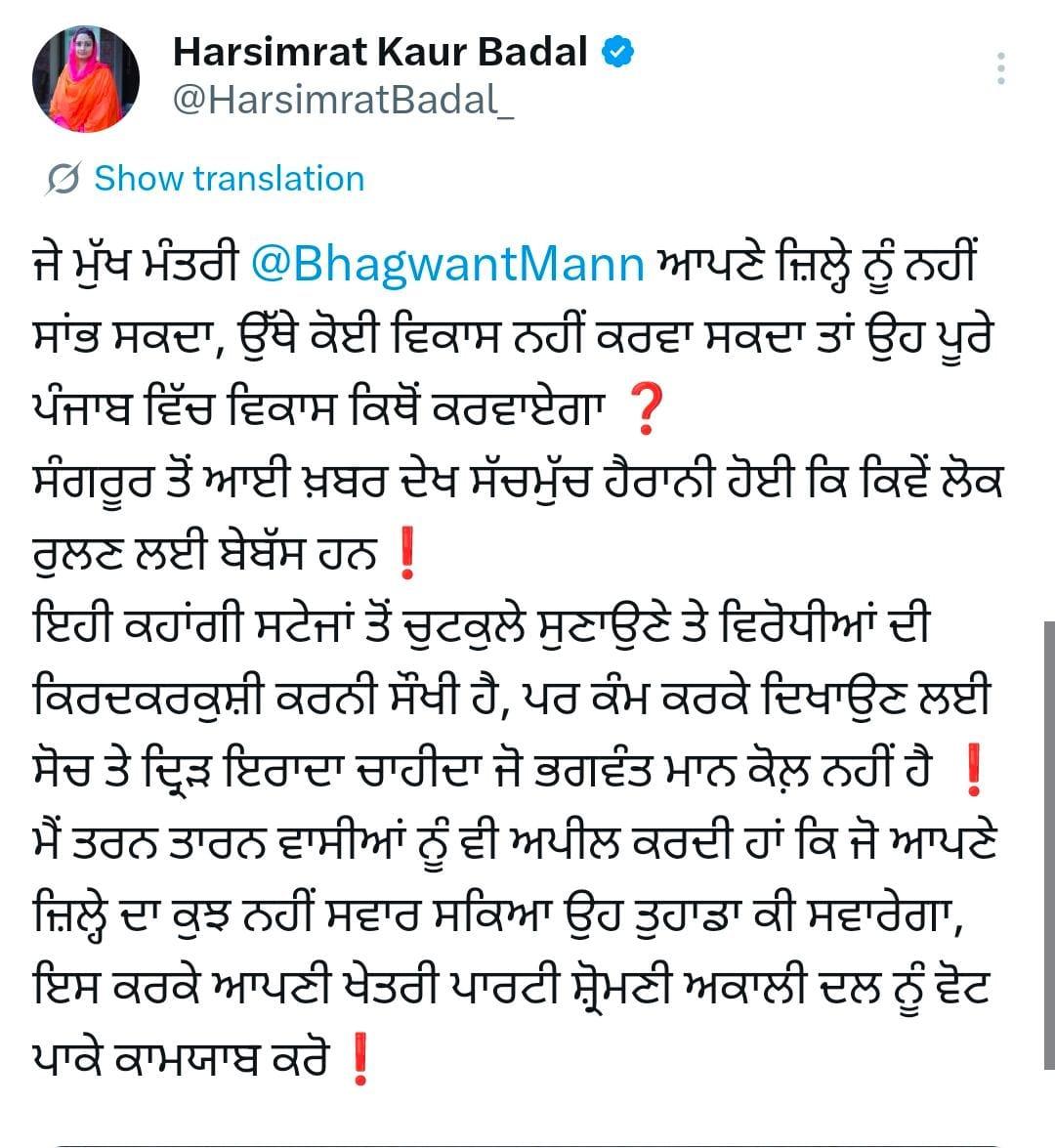 ਉਧਰ, ਬਠਿੰਡਾ ਤੋਂ ਸ਼੍ਰੋਮਣੀ ਅਕਾਲੀ ਦਲ ਦੀ ਸਾਂਸਦ ਹਰਸਿਮਰਤ ਕੌਰ ਬਾਦਲ ਨੇ ਮੁੱਖ ਮੰਤਰੀ ਭਗਵੰਤ ਮਾਨ ਨੂੰ ਆਪਣੇ ਜ਼ਿਲ੍ਹੇ ਦੇ ਅਜਿਹੇ ਹਾਲਾਤਾਂ ਲਈ ਕਰੜੇ ਹੱਥੀਂ ਲਿਆ ਹੈ। ਉਨ੍ਹਾਂ ਆਪਣੇ ਸੋਸ਼ਲ ਮੀਡੀਆ ਹੈਂਡਲ 'ਤੇ ਪੋਸਟ ਸਾਂਝੀ ਕਰਦਿਆਂ ਕਿਹਾ ਕਿ ਜੇਕਰ ਸੀਐਮ ਦੇ ਆਪਣੇ ਸ਼ਹਿਰ ਦਾ ਇਹ ਹਾਲ ਹੈ ਤਾਂ ਬਾਕੀ ਪੰਜਾਬ 'ਚ ਸਹਿਜੇ ਹੀ ਅੰਦਾਜ਼ਾ ਲਗਾਇਆ ਜਾ ਸਕਦਾ ਹੈ।