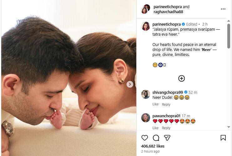 ਦਰਅਸਲ, ਪਰਿਣੀਤੀ ਅਤੇ ਰਾਘਵ ਨੇ ਆਪਣੇ ਸੋਸ਼ਲ ਮੀਡੀਆ ਹੈਂਡਲ 'ਤੇ ਇੱਕ ਤਸਵੀਰ ਸਾਂਝੀ ਕੀਤੀ ਹੈ। ਇਸ ਤਸਵੀਰ ਵਿੱਚ, ਪਰਿਣੀਤੀ ਅਤੇ ਰਾਘਵ ਆਪਣੇ ਪੁੱਤਰ ਨੀਰਜ ਦੇ ਪੈਰਾਂ ਨੂੰ ਪਿਆਰ ਨਾਲ ਚੁੰਮਦੇ ਹੋਏ ਦਿਖਾਈ ਦੇ ਰਹੇ ਹਨ। ਇਸ ਪਿਆਰੀ ਤਸਵੀਰ ਦੇ ਨਾਲ, ਜੋੜੇ ਨੇ ਇੱਕ ਕੈਪਸ਼ਨ ਵੀ ਲਿਖਿਆ ਹੈ ਅਤੇ ਕੈਪਸ਼ਨ ਵਿੱਚ ਪੁੱਤਰ ਦਾ ਨਾਮ ਦੱਸਿਆ ਹੈ।