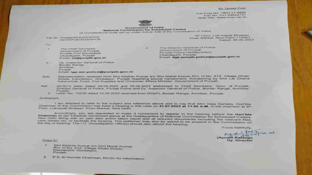 Punjab News: ਪੰਜਾਬ ਪੁਲਿਸ ਵੱਲੋਂ ਪੰਜਾਬ ਦੇ ਕੈਬਨਿਟ ਮੰਤਰੀ ਲਾਲ ਚੰਦ ਕਟਾਰੂਚੱਕ ਖ਼ਿਲਾਫ਼ ਜਿਨਸੀ ਸ਼ੋਸ਼ਣ ਦੇ ਦੋਸ਼ਾਂ ਦੇ ਮਾਮਲੇ ਵਿੱਚ ਕੌਮੀ ਅਨੁਸੂਚਿਤ ਜਾਤੀ ਕਮਿਸ਼ਨ ਨੂੰ ਆਪਣੀ ਕਾਰਵਾਈ ਰਿਪੋਰਟ ਸੌਂਪਣ ਦੇ ਕਰੀਬ ਦੋ ਹਫ਼ਤਿਆਂ ਬਾਅਦ ਕਮਿਸ਼ਨ ਨੇ 31 ਜੁਲਾਈ ਨੂੰ ਸਵੇਰੇ 11 ਵਜੇ ਨਵੀਂ ਦਿੱਲੀ ਵਿਖੇ ਸੱਦਿਆ ਹੈ। ਪੰਜਾਬ ਸਰਕਾਰ ਦੇ ਅਧਿਕਾਰੀਆਂ ਨੂੰ ਨਵੀਂ ਦਿੱਲੀ ਵਿਖੇ ਕਮਿਸ਼ਨ ਦੇ ਮੁੱਖ ਦਫ਼ਤਰ ਵਿਖੇ ਹਾਜ਼ਰ ਰਹਿਣ ਲਈ ਕਿਹਾ ਗਿਆ ਹੈ।
