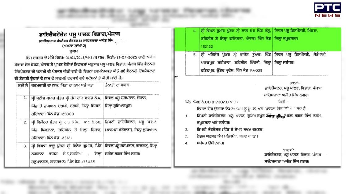 ਦੱਸ ਦਈਏ ਕਿ ਪਸ਼ੂ ਪਾਲਣ ਵਿਭਾਗ ’ਚ ਮੁਨੀਸ਼ ਕੁਮਾਰ ਜੋ ਕਿ ਸਿਰਸਾ ਦਾ ਰਹਿਣ ਵਾਲਾ ਹੈ ਦੀ ਪੋਸਟਿੰਗ ਹੁਸ਼ਿਆਰਪੁਰ ਚ ਕੀਤੀ ਗਈ ਹੈ। ਦੂਜੇ ਪਾਸੇ ਵਿਜੇਂਦਰ ਕੁਮਾਰ ਜੋ ਕਿ ਹਿਸਾਰ ਦਾ ਰਹਿਣ ਵਾਲਾ ਹੈ ਇਸਦੀ ਪੋਸਟਿਗ ਲੁਧਿਆਣਾ ’ਚ ਕੀਤੀ ਗਈ ਹੈ। ਵਿਕਾਸ ਭਾਦੂ ਜੋਕਿ ਰਾਜਸਥਾਨ ਦਾ ਰਹਿਣ ਵਾਲਾ ਹੈ ਇਸਦੀ ਪੋਸਟਿਗ ਸ਼ਹੀਦ ਭਗਤ ਸਿੰਘ ਨਗਰ ’ਚ ਕੀਤੀ ਗਈ ਹੈ। ਇਸ ਤੋਂ ਇਲਾਵਾ ਅਭਿਸ਼ੇਕ ਜੋ ਕਿ ਫਤਿਹਪੁਰ ਉੱਤਰਪ੍ਰਦੇਸ਼ ਦਾ ਰਹਿਣ ਵਾਲਾ ਹੈ ਦੀ ਪੋਸਟਿੰਗ ਜਲੰਧਰ ਵਿਖੇ ਕੀਤੀ ਗਈ।