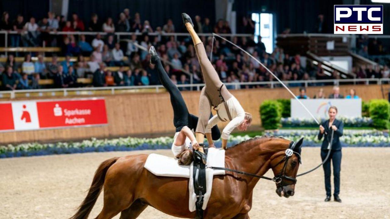 ਘੋੜਸਵਾਰੀ ਵਿੱਚ ਸਾਰੇ ਪ੍ਰਤੀਯੋਗੀ ਫੌਜ ਦੇ ਅਧਿਕਾਰੀ ਸਨ ਅਤੇ ਹਰੇਕ ਨੂੰ ਚਾਰ ਵੱਖ-ਵੱਖ ਅਭਿਆਸ ਕਰਨੇ ਪੈਂਦੇ ਸਨ। ਸਭ ਤੋਂ ਪਹਿਲਾਂ ਉਸ ਨੂੰ ਘੋੜੇ 'ਤੇ ਖੜ੍ਹੇ ਹੋ ਕੇ ਛਾਲ ਮਾਰਨੀ ਪੈਂਦੀ ਸੀ ਅਤੇ ਫਿਰ ਦੋਵਾਂ ਪਾਸਿਆਂ ਤੋਂ ਛਾਲ ਮਾਰਨੀ ਪੈਂਦੀ ਸੀ। ਦੂਜੀ ਕੋਸ਼ਿਸ਼ ਘੋੜੇ ਦੀ ਪਿੱਠ ਉੱਤੇ ਛਾਲ ਮਾਰਨ ਦੀ ਸੀ। ਤੀਸਰਾ ਅਭਿਆਸ ਸੀ ਸਾਲਟੋ (ਏਰੀਅਲ ਫਾਰਵਰਡ ਰੋਲ) ਨਾਲ ਘੋੜੇ ਉੱਤੇ ਛਾਲ ਮਾਰਨਾ, ਅਤੇ ਆਖਰੀ ਅਭਿਆਸ ਜਿਮਨਾਸਟਿਕ ਕਰਨਾ ਸੀ ਜਦੋਂ ਘੋੜਾ ਚੱਲ ਰਿਹਾ ਸੀ। ਵੌਲਟਿੰਗ ਘੋੜਸਵਾਰੀ ਦੀ ਖੇਡ ਵਜੋਂ ਜਾਰੀ ਹੈ।