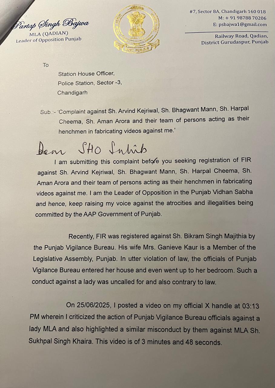 Partap Bajwa Complaint Against Kejriwal and CM Mann : ਪੰਜਾਬ ਵਿਧਾਨ ਸਭਾ ਵਿੱਚ ਵਿਰੋਧੀ ਧਿਰ ਦੇ ਨੇਤਾ ਪ੍ਰਤਾਪ ਸਿੰਘ ਬਾਜਵਾ ਨੇ ਆਮ ਆਦਮੀ ਪਾਰਟੀ (AAP) ਦੇ ਚੋਟੀ ਦੇ ਆਗੂਆਂ 'ਤੇ ਗੰਭੀਰ ਇਲਜ਼ਾਮ ਲਗਾਏ ਹਨ। ਉਨ੍ਹਾਂ ਅਰਵਿੰਦ ਕੇਜਰੀਵਾਲ, ਭਗਵੰਤ ਮਾਨ, ਹਰਪਾਲ ਚੀਮਾ, ਅਮਨ ਅਰੋੜਾ ਅਤੇ ਉਨ੍ਹਾਂ ਦੀ ਟੀਮ 'ਤੇ ਵੀਡੀਓ ਨਾਲ ਛੇੜਛਾੜ ਕਰਕੇ ਉਨ੍ਹਾਂ ਨੂੰ ਬਦਨਾਮ ਕਰਨ ਦਾ ਇਲਜ਼ਾਮ ਲਗਾਇਆ ਹੈ। ਇਸ ਸਬੰਧ ਵਿੱਚ, ਉਨ੍ਹਾਂ ਨੇ ਸੈਕਟਰ-3, ਚੰਡੀਗੜ੍ਹ ਦੇ ਸਟੇਸ਼ਨ ਇੰਚਾਰਜ ਨੂੰ ਇੱਕ ਸ਼ਿਕਾਇਤ ਪੱਤਰ ਸੌਂਪਿਆ ਹੈ ਅਤੇ ਐਫਆਈਆਰ ਦਰਜ ਕਰਨ ਦੀ ਮੰਗ ਕੀਤੀ ਹੈ।