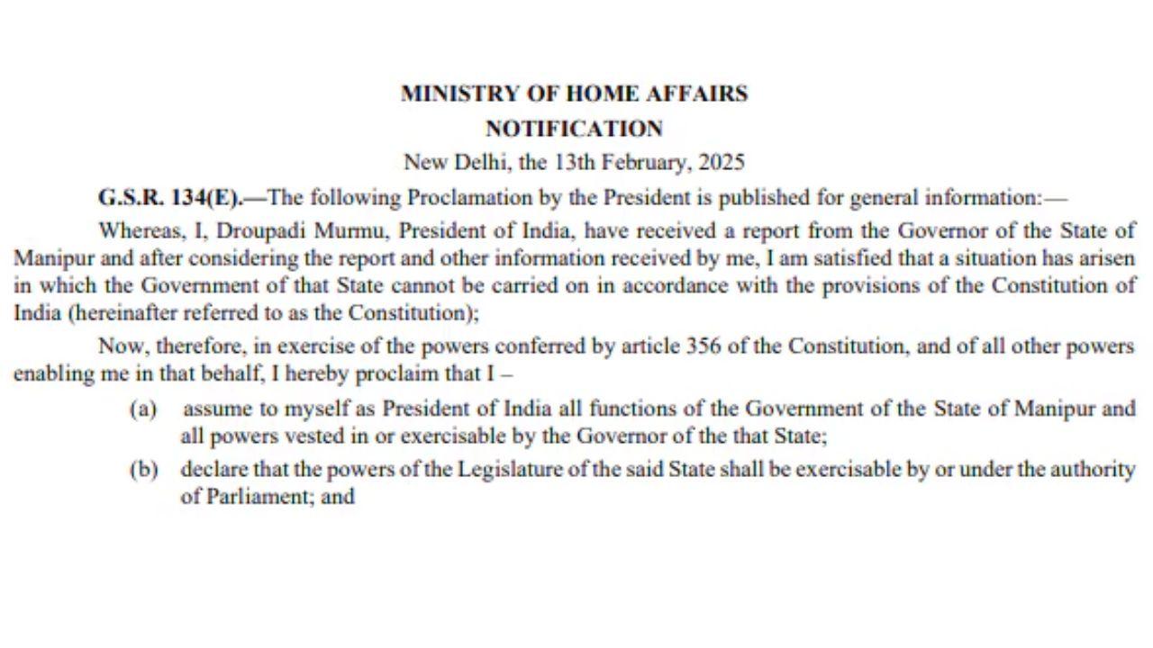 ਨੋਟੀਫਿਕੇਸ਼ਨ ਵਿੱਚ ਕਿਹਾ ਗਿਆ ਹੈ, 'ਹੁਣ ਸੰਵਿਧਾਨ ਦੇ ਅਨੁਛੇਦ 356 ਰਾਹੀਂ ਪ੍ਰਦਾਨ ਕੀਤੀਆਂ ਗਈਆਂ ਸ਼ਕਤੀਆਂ ਅਤੇ ਇਸ ਪੱਖ ਵਿੱਚ ਮੈਨੂੰ ਸਮਰੱਥ ਬਣਾਉਣ ਵਾਲੀਆਂ ਹੋਰ ਸਾਰੀਆਂ ਸ਼ਕਤੀਆਂ ਦੀ ਵਰਤੋਂ ਕਰਦੇ ਹੋਏ, ਮੈਂ ਐਲਾਨ ਕਰਦੀ ਹਾਂ ਕਿ ਮੈਂ, ਭਾਰਤ ਦੇ ਰਾਸ਼ਟਰਪਤੀ ਦੇ ਰੂਪ ਵਿੱਚ, ਮਨੀਪੁਰ ਰਾਜ ਦੀ ਸਰਕਾਰ ਦੇ ਸਾਰੇ ਕਾਰਜ ਅਤੇ ਉਸ ਰਾਜ ਦੇ ਰਾਜਪਾਲ ਰਾਹੀਂ ਨਿਯਤ ਜਾਂ ਵਰਤੀਆਂ ਗਈਆਂ ਸਾਰੀਆਂ ਸ਼ਕਤੀਆਂ ਨੂੰ ਗ੍ਰਹਿਣ ਕਰਦੀ ਹਾਂ।'