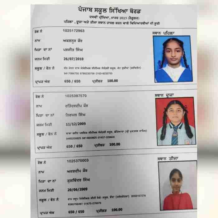 ਜਾਣਕਾਰੀ ਅਨੁਸਾਰ ਫ਼ਰੀਦਕੋਟ ਦੀ ਅਕਸ਼ਨੂਰ ਕੌਰ ਨੇ 650 'ਚੋਂ 650 ਅੰਕ ਪ੍ਰਾਪਤ ਕਰਕੇ ਸੂਬੇ 'ਚੋਂ ਪਹਿਲਾ ਸਥਾਨ ਹਾਸਿਲ ਕੀਤਾ ਹੈ। ਸ਼੍ਰੀ ਮੁਕਤਸਰ ਸਾਹਿਬ ਦੀ ਰਤਿੰਦਰਦੀਪ ਕੌਰ ਨੇ 650 'ਚੋਂ 650 ਅੰਕ ਪ੍ਰਾਪਤ ਕਰਕੇ ਸੂਬੇ 'ਚੋਂ ਦੂਜਾ ਸਥਾਨ ਹਾਸਲ ਕੀਤਾ ਹੈ। ਮਲੇਰਕੋਟਲਾ ਤੋਂ ਅਰਸ਼ਦੀਪ ਕੌਰ ਨੇ ਵੀ 650 'ਚੋ 650 ਅੰਕ ਪ੍ਰਾਪਤ ਕਰਕੇ ਸੂਬੇ 'ਚੋਂ ਤੀਜਾ ਸਥਾਨ ਹਾਸਲ ਕੀਤਾ ਹੈ। ਤਿੰਨੋ ਸਥਾਨਾਂ 'ਤੇ ਰਹਿਣ ਵਾਲੀਆਂ ਵਿਦਿਆਰਥਣਾਂ ਦੇ ਅੰਕ ਇਕੋ ਜਿਹੇ ਹਨ ਪਰ ਉਮਰ ਦੇ ਕਰਕੇ ਪਹਿਲਾ ,ਦੂਜਾ ਅਤੇ ਤੀਜਾ ਸਥਾਨ ਮਿਲਿਆ ਹੈ।