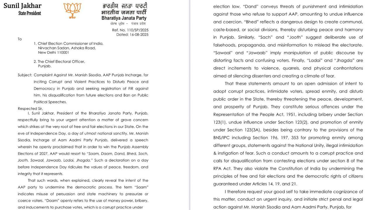 ਆਪਣੀ ਸ਼ਿਕਾਇਤ ਵਿੱਚ ਜਾਖੜ ਨੇ ਇਲਜ਼ਾਮ ਲਗਾਇਆ ਕਿ ਸਿਸੋਦੀਆ ਨੇ 15 ਅਗਸਤ ਨੂੰ ਇੱਕ ਭਾਸ਼ਣ ਦੌਰਾਨ "ਖੁੱਲ੍ਹੇਆਮ ਐਲਾਨ" ਕੀਤਾ ਸੀ ਕਿ ਅਗਲੀਆਂ ਪੰਜਾਬ ਚੋਣਾਂ ਜਿੱਤਣ ਲਈ, 'ਆਪ' "ਸਾਮ, ਦਾਮ, ਡੰਡ, ਭੇਦ, ਸੱਚ, ਜੂਠ, ਸਵਾਲ, ਜਵਾਬ, ਲੜਾਈ, ਝਗੜਾ" (ਕੂਟਨੀਤੀ, ਪ੍ਰੋਤਸਾਹਨ, ਸਜ਼ਾ, ਵੰਡ, ਸੱਚ, ਝੂਠ, ਸਵਾਲ, ਜਵਾਬ, ਲੜਾਈ, ਝਗੜਾ) ਦਾ ਸਹਾਰਾ ਲਵੇਗੀ।