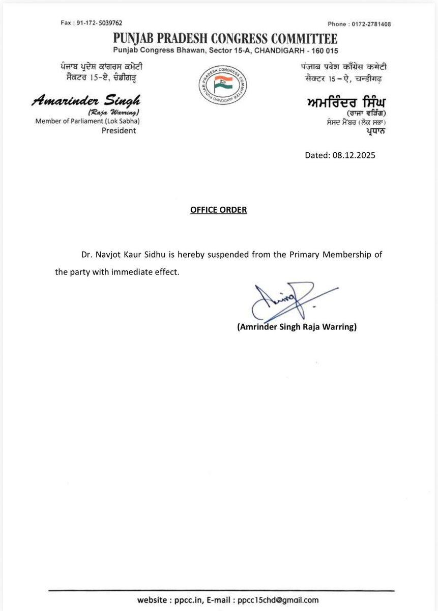 Navjot Kaur Sidhu News : ਪੰਜਾਬ ਕਾਂਗਰਸ ਪ੍ਰਧਾਨ ਅਮਰਿੰਦਰ ਸਿੰਘ ਰਾਜਾ ਵੜਿੰਗ ਨੇ ਸਾਬਕਾ ਕ੍ਰਿਕਟਰ ਅਤੇ ਕਾਂਗਰਸੀ ਨੇਤਾ ਨਵਜੋਤ ਸਿੰਘ ਸਿੱਧੂ ਦੀ ਪਤਨੀ ਡਾ. ਨਵਜੋਤ ਕੌਰ ਸਿੱਧੂ ਨੂੰ ਪਾਰਟੀ ਤੋਂ ਮੁਅੱਤਲ ਕਰ ਦਿੱਤਾ ਹੈ। ਕਾਂਗਰਸ ਪ੍ਰਧਾਨ ਅਮਰਿੰਦਰ ਸਿੰਘ ਰਾਜਾ ਵੜਿੰਗ ਨੇ ਉਨ੍ਹਾਂ ਨੂੰ ਪਾਰਟੀ ਦੀ ਮੁੱਢਲੀ ਮੈਂਬਰਸ਼ਿਪ ਤੋਂ ਮੁਅੱਤਲ ਕਰਨ ਦਾ ਹੁਕਮ ਜਾਰੀ ਕੀਤਾ। ਉਨ੍ਹਾਂ ਨੂੰ ਸਸਪੈਂਡ ਕਰਨ ਦਾ ਕੋਈ ਕਾਰਨ ਨਹੀਂ ਦੱਸਿਆ। ਪਿਛਲੇ ਕੁਝ ਦਿਨਾਂ ਤੋਂ ਨਵਜੋਤ ਕੌਰ ਸਿੱਧੂ ਪੰਜਾਬ ਵਿੱਚ ਕਾਂਗਰਸ ਅਤੇ ਇਸਦੇ ਸੀਨੀਅਰ ਨੇਤਾਵਾਂ ਵਿਰੁੱਧ ਸਿੱਧੇ ਬਿਆਨ ਦੇ ਰਹੇ ਹਨ, ਜਿਸ ਨਾਲ ਪਾਰਟੀ ਅੰਦਰ ਸਖ਼ਤ ਵਿਰੋਧ ਹੋ ਰਿਹਾ ਸੀ।