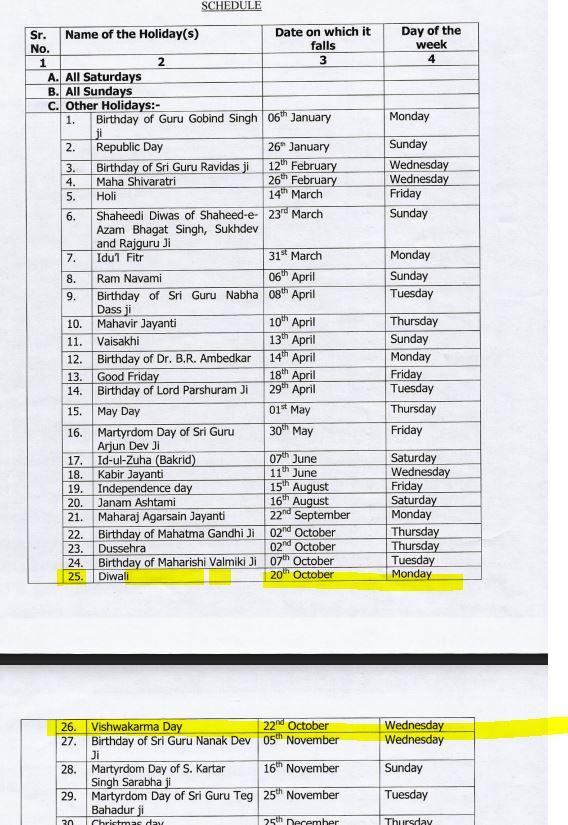 ਦੂਜੇ ਪਾਸੇ 16 ਅਕਤੂਬਰ ਨੂੰ ਬਾਬਾ ਬੰਦਾ ਸਿੰਘ ਬਹਾਦਰ ਦੇ ਜਨਮ ਦਿਨ, 22 ਅਕਤੂਬਰ ਨੂੰ ਗੋਵਰਧਨ ਪੂਜਾ ਅਤੇ 23 ਅਕਤੂਬਰ ਨੂੰ ਸ੍ਰੀ ਗੁਰੂ ਗ੍ਰੰਥ ਸਾਹਿਬ ਦੇ ਗੁਰੂ ਗੱਦੀ ਦਿਵਸ ਲਈ ਰਾਖਵੀਆਂ ਛੁੱਟੀਆਂ ਦਾ ਐਲਾਨ ਕੀਤਾ ਗਿਆ ਹੈ। ਰਾਖਵੀਆਂ ਛੁੱਟੀਆਂ ਵਾਲੇ ਦਿਨ ਸਰਕਾਰੀ ਦਫ਼ਤਰ ਖੁੱਲ੍ਹੇ ਰਹਿੰਦੇ ਹਨ ਅਤੇ ਨਿਯਮਤ ਕੰਮ ਹੁੰਦਾ ਹੈ।