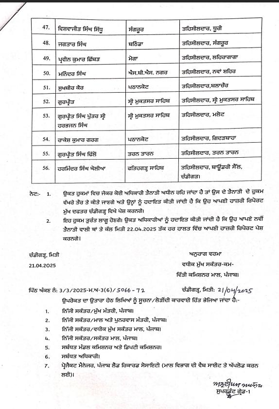 ਪੰਜਾਬ ਵਿੱਚ ਵੱਡਾ ਪ੍ਰਸ਼ਾਸਨਿਕ ਫੇਰਬਦਲ ਹੋਇਆ ਹੈ। ਪੰਜਾਬ ਸਰਕਾਰ ਨੇ ਮਾਲ ਵਿਭਾਗ ਵਿੱਚ ਵੱਡਾ ਫੇਰਬਦਲ ਕੀਤਾ ਹੈ। 56 ਤਹਿਸੀਲਦਾਰ ਅਤੇ 166 ਨਾਇਬ ਤਹਿਸੀਲਦਾਰ ਦੇ ਤਬਾਦਲੇ ਹੋਏ ਹਨ।