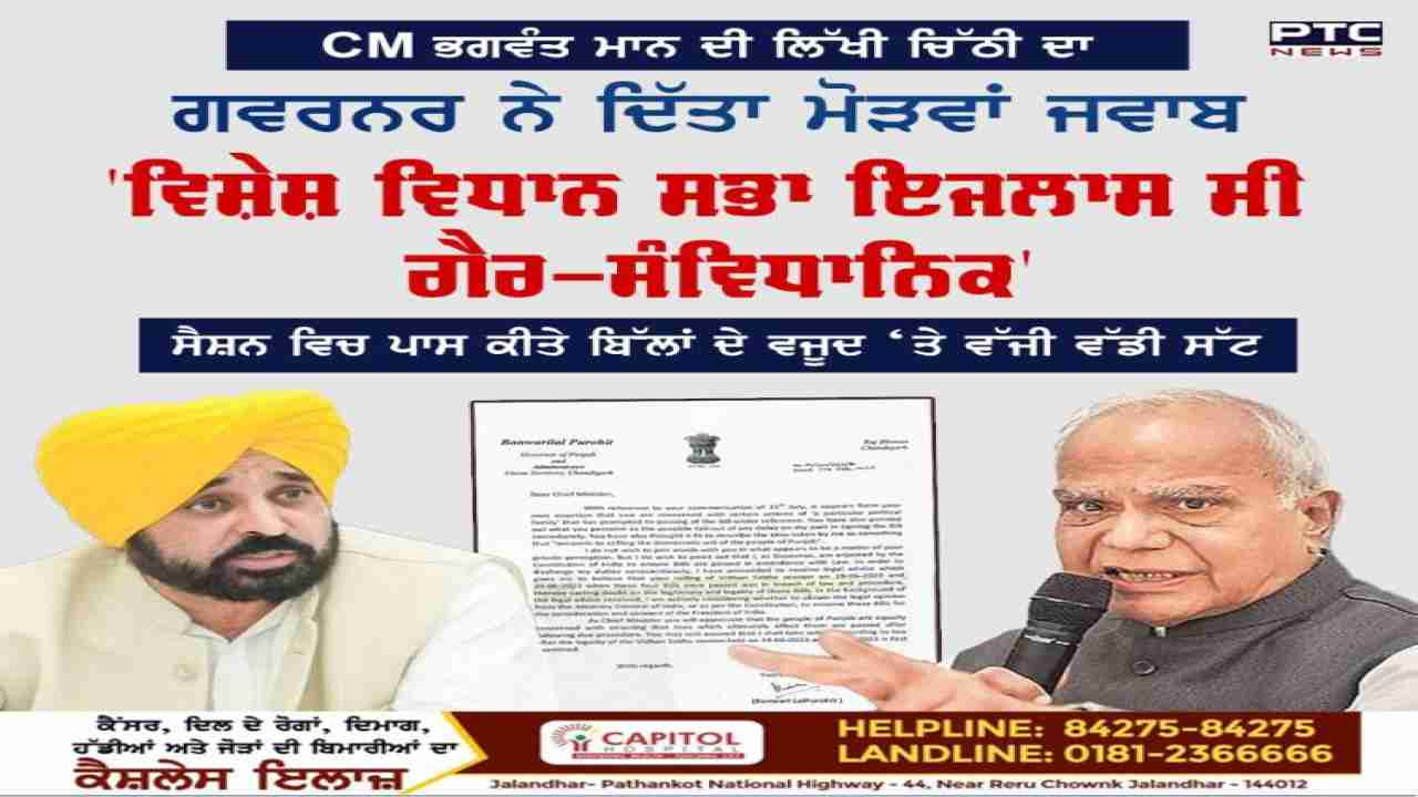 ਰਾਜਪਾਲ ਬਨਵਾਰੀਲਾਲ ਪੁਰੋਹਿਤ ਨੇ ਮੁੱਖ ਮੰਤਰੀ ਮਾਨ ਨੂੰ ਲਿਖਿਆ, “ਤੁਹਾਡਾ ਵਿਧਾਨ ਸਭਾ ਸੈਸ਼ਨ 19-06-2023 ਅਤੇ 20-06-2023 ਨੂੰ ਬੁਲਾਇਆ ਗਿਆ ਜਦੋਂ ਇਹ ਚਾਰ ਬਿੱਲ ਪਾਸ ਕੀਤੇ ਗਏ ਸਨ, ਕਾਨੂੰਨ ਅਤੇ ਪ੍ਰਕਿਰਿਆ ਦੀ ਉਲੰਘਣਾ ਸੀ, ਜਿਸ ਨਾਲ ਉਨ੍ਹਾਂ ਬਿੱਲਾਂ ਦੀ ਜਾਇਜ਼ਤਾ ਅਤੇ ਕਾਨੂੰਨੀਤਾ 'ਤੇ ਸ਼ੱਕ ਪੈਦਾ ਹੋਇਆ ਸੀ। ਪ੍ਰਾਪਤ ਹੋਈ ਕਾਨੂੰਨੀ ਸਲਾਹ ਦੇ ਪਿਛੋਕੜ ਵਿੱਚ, ਮੈਂ ਸਰਗਰਮੀ ਨਾਲ ਵਿਚਾਰ ਕਰ ਰਿਹਾ ਹਾਂ ਕਿ ਕੀ ਭਾਰਤ ਦੇ ਅਟਾਰਨੀ ਜਨਰਲ ਤੋਂ ਕਾਨੂੰਨੀ ਰਾਏ ਪ੍ਰਾਪਤ ਕੀਤੀ ਜਾਵੇ ਜਾਂ ਸੰਵਿਧਾਨ ਦੇ ਅਨੁਸਾਰ ਇਹਨਾਂ ਬਿੱਲਾਂ ਨੂੰ ਭਾਰਤ ਦੇ ਰਾਸ਼ਟਰਪਤੀ ਦੀ ਵਿਚਾਰ ਅਤੇ ਸਹਿਮਤੀ ਲਈ ਰਾਖਵਾਂ ਰੱਖਿਆ ਜਾਵੇ।”