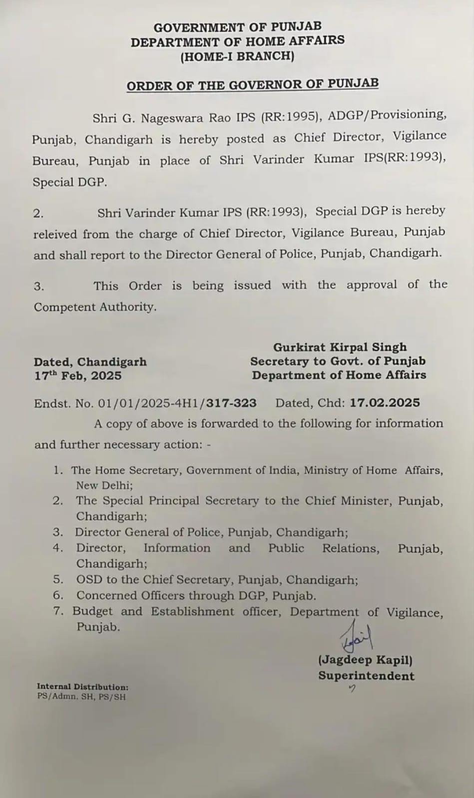 Punjab Vigilance Bureau : ਦਿੱਲੀ ਚੋਣਾਂ ਤੋਂ ਬਾਅਦ ਪੰਜਾਬ 'ਚ ਵੱਡਾ ਤਬਾਦਲਾ ਹੋਇਆ ਹੈ। ਪੰਜਾਬ ਸਰਕਾਰ (Punjab Government) ਨੇ ਵਿਜੀਲੈਂਸ ਬਿਓਰੋ ਚੀਫ਼ ਵਰਿੰਦਰ ਕੁਮਾਰ (Varinder Kumar IPS) ਨੂੰ ਹਟਾ ਦਿੱਤਾ ਹੈ। ਵਰਿੰਦਰ ਕੁਮਾਰ ਨੂੰ ਸਰਕਾਰ ਨੇ ਸੇਵਾਮੁਕਤੀ ਤੋਂ 5 ਮਹੀਨੇ ਪਹਿਲਾਂ ਹੀ ਅਹੁਦੇ ਤੋਂ ਲਾਂਭੇ ਕਰ ਦਿੱਤਾ ਹੈ। ਜਦਕਿ ਉਨ੍ਹਾਂ ਦੀ ਥਾਂ ਜੀ. ਨਾਗੇਸ਼ਵਰ ਰਾਓ, ਆਈਪੀਐਸ, ਏਡੀਜੀਪੀ, ਪ੍ਰੋਵੀਜ਼ਨਿੰਗ ਨੂੰ ਵਰਿੰਦਰ ਕੁਮਾਰ ਦੀ ਥਾਂ 'ਤੇ ਮੁੱਖ ਨਿਰਦੇਸ਼ਕ, ਵਿਜੀਲੈਂਸ ਨਿਯੁਕਤ ਕੀਤਾ ਹੈ।