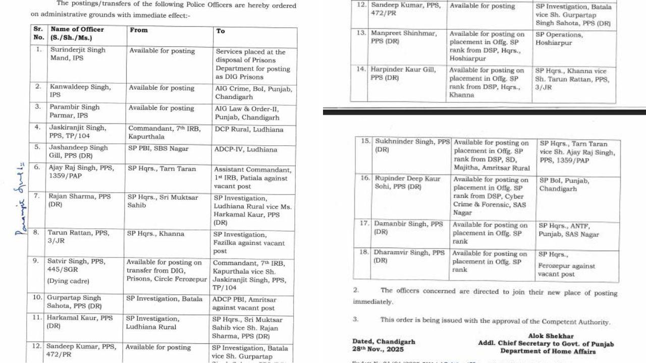 Punjab Police Transfers List : ਵਿਭਾਗ ਵੱਲੋਂ ਜਾਰੀ ਹੁਕਮਾਂ ਅਨੁਸਾਰ, ਆਈਪੀਐਸ ਸੁਰਿੰਦਰਜੀਤ ਸਿੰਘ ਮੰਡ ਨੂੰ ਡੀਆਈਜੀ ਜੇਲ੍ਹ, ਕੰਵਲਦੀਪ ਸਿੰਘ ਨੂੰ ਏਆਈਜੀ ਕ੍ਰਾਈਮ ਪੰਜਾਬ ਚੰਡੀਗੜ੍ਹ ਅਤੇ ਪਰਮਬੀਰ ਸਿੰਘ ਪਰਮਾਰ ਨੂੰ ਏਆਈਜੀ ਲਾਅ ਐਂਡ ਆਰਡਰ-2 ਪੰਜਾਬ ਨਿਯੁਕਤ ਕੀਤਾ ਗਿਆ ਹੈ।