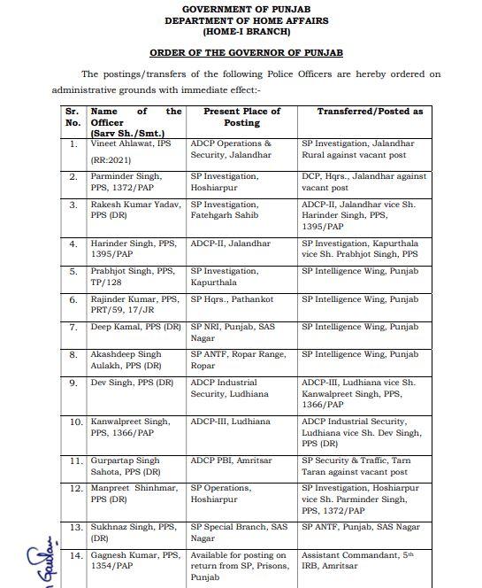 ਇੱਥੇ ਜਾਰੀ ਹੁਕਮਾਂ ਅਨੁਸਾਰ, 2021 ਬੈਚ ਦੇ ਆਈਪੀਐਸ ਅਧਿਕਾਰੀ ਵਿਨੀਤ ਅਹਲਾਵਤ ਨੂੰ ਏਡੀਸੀਪੀ, ਆਪ੍ਰੇਸ਼ਨ ਅਤੇ ਸੁਰੱਖਿਆ, ਜਲੰਧਰ ਦੇ ਮੌਜੂਦਾ ਅਹੁਦੇ ਤੋਂ ਸੁਪਰਡੈਂਟ ਆਫ਼ ਪੁਲਿਸ, ਇਨਵੈਸਟੀਗੇਸ਼ਨ ਵਜੋਂ ਤਬਦੀਲ ਕਰ ਦਿੱਤਾ ਗਿਆ ਹੈ।