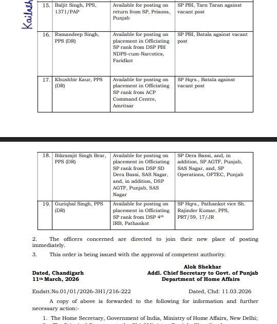 Punjab Police Transfers List : ਪੰਜਾਬ ਸਰਕਾਰ ਨੇ ਬੁੱਧਵਾਰ ਨੂੰ 19 ਪੁਲਿਸ ਅਧਿਕਾਰੀਆਂ ਦੇ ਤਬਾਦਲੇ ਕੀਤੇ। ਇਹ ਨਿਯੁਕਤੀਆਂ ਤੁਰੰਤ ਪ੍ਰਭਾਵ ਨਾਲ ਲਾਗੂ ਹੋਣਗੀਆਂ।