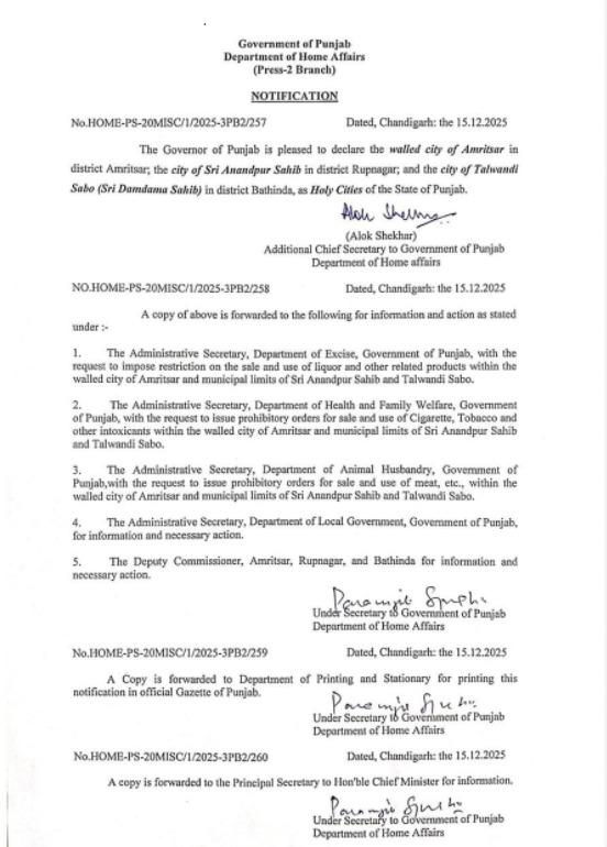Punjab Holy City : ਪੰਜਾਬ ਦੇ ਤਿੰਨ ਸ਼ਹਿਰਾਂ ਨੂੰ ਪਵਿੱਤਰ ਸ਼ਹਿਰ ਦਾ ਦਰਜਾ ਦਿੱਤਾ ਗਿਆ ਹੈ। ਇਨ੍ਹਾਂ ਵਿੱਚ ਅੰਮ੍ਰਿਤਸਰ, ਸ੍ਰੀ ਆਨੰਦਪੁਰ ਸਾਹਿਬ ਅਤੇ ਤਲਵੰਡੀ ਸਾਬੋ ਸ਼ਾਮਲ ਹਨ। ਪੰਜਾਬ ਦੇ ਰਾਜਪਾਲ ਨੇ ਵਿਧਾਨ ਸਭਾ ਵਿੱਚ ਲਏ ਗਏ ਇਸ ਫੈਸਲੇ ਨੂੰ ਮਨਜ਼ੂਰੀ ਦੇ ਦਿੱਤੀ ਹੈ।