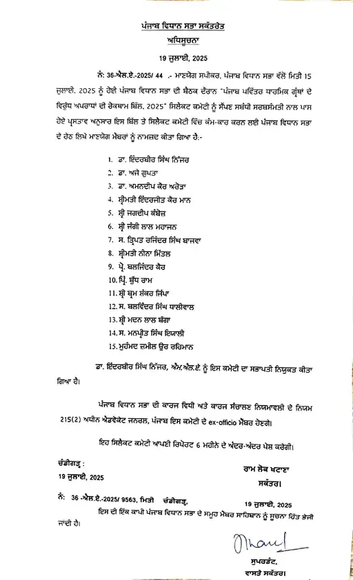 ਇਸ ਕਮੇਟੀ ਵਿਚ 11 ‘ਆਪ’, ਦੋ ਕਾਂਗਰਸ, ਇਕ ਭਾਜਪਾ ਤੇ ਇਕ ਅਕਾਲੀ ਦਲ ਦਾ ਮੈਂਬਰ ਲਿਆ ਗਿਆ ਹੈ। ਪੰਜਾਬ ਵਿਧਾਨ ਸਭਾ ਦੇ ਵਿਸ਼ੇਸ਼ ਇਜਲਾਸ ਦੇ ਆਖਰੀ ਦਿਨ ਸਦਨ ਨੇ ਬੇਅਦਬੀ ਖ਼ਿਲਾਫ਼ ਬਿੱਲ ਵਿਧਾਨ ਸਭਾ ਦੀ ਸਿਲੈਕਟ ਕਮੇਟੀ ਹਵਾਲੇ ਕਰਨ ਦਾ ਫ਼ੈਸਲਾ ਕੀਤਾ ਸੀ ਤਾਂ ਕਿ ਕਾਨੂੰਨ ਬਣਾਉਣ ਤੋਂ ਪਹਿਲਾਂ ਪ੍ਰਸਤਾਵਿਤ ਬਿੱਲ ’ਤੇ ਲੋਕਾਂ ਦੀ ਰਾਇ ਲਈ ਜਾ ਸਕੇ। ਮੁੱਖ ਮੰਤਰੀ ਭਗਵੰਤ ਮਾਨ ਨੇ ਸਦਨ ’ਚ ‘ਪੰਜਾਬ ਪਵਿੱਤਰ ਗ੍ਰੰਥਾਂ ਵਿਰੁੱਧ ਅਪਰਾਧ ਰੋਕਥਾਮ ਬਿੱਲ-2025’ ਪੇਸ਼ ਕੀਤਾ ਸੀ।