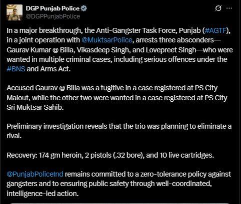 ਡੀਜੀਪੀ ਪੰਜਾਬ ਗੌਰਵ ਯਾਦਵ ਨੇ ਐਕਸ 'ਤੇ ਜਾਣਕਾਰੀ ਦਿੰਦਿਆਂ ਦੱਸਿਆ ਕਿ ਗੌਰਵ ਉਰਫ਼ ਬਿੱਲਾ, ਥਾਣਾ ਸਿਟੀ ਮਲੋਟ ਵਿਖੇ ਦਰਜ ਇੱਕ ਮਾਮਲੇ ਵਿੱਚ ਭਗੌੜਾ ਸੀ, ਜਦੋਂ ਕਿ ਵਿਕਾਸਦੀਪ ਸਿੰਘ ਅਤੇ ਲਵਪ੍ਰੀਤ ਸਿੰਘ ਥਾਣਾ ਸਿਟੀ, ਸ੍ਰੀ ਮੁਕਤਸਰ ਸਾਹਿਬ ਵਿਖੇ ਦਰਜ ਇੱਕ ਹੋਰ ਮਾਮਲੇ ਵਿੱਚ ਲੋੜੀਂਦੇ ਸਨ।