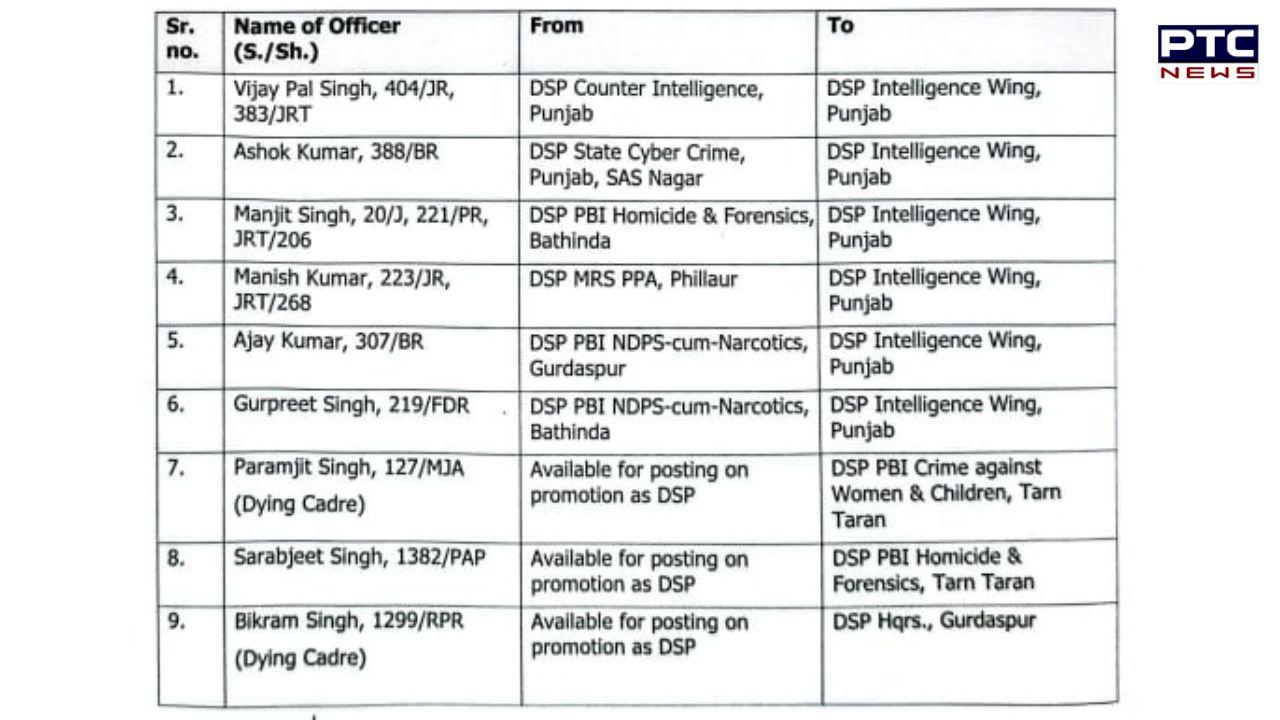 ਤਬਾਦਲੇ ਦੀ ਸੂਚੀ ਵਿੱਚ ਸ਼ਾਮਲ ਅਧਿਕਾਰੀਆਂ ਵਿੱਚ ਵਿਜੇ ਪਾਲ ਸਿੰਘ, ਅਸ਼ੋਕ ਕੁਮਾਰ, ਮਨਜੀਤ ਸਿੰਘ, ਮਨੀਸ਼ ਕੁਮਾਰ, ਅਜੈ ਕੁਮਾਰ ਅਤੇ ਗੁਰਪ੍ਰੀਤ ਸਿੰਘ ਸ਼ਾਮਲ ਹਨ, ਜਿਨ੍ਹਾਂ ਨੂੰ ਵੱਖ-ਵੱਖ ਯੂਨਿਟਾਂ ਤੋਂ ਡੀਐਸਪੀ ਇੰਟੈਲੀਜੈਂਸ ਵਿੰਗ, ਪੰਜਾਬ ਵਿੱਚ ਤਬਦੀਲ ਕੀਤਾ ਗਿਆ ਹੈ। ਮੰਨਿਆ ਜਾ ਰਿਹਾ ਹੈ ਕਿ ਸੂਬੇ ਵਿੱਚ ਕਾਨੂੰਨ ਵਿਵਸਥਾ ਅਤੇ ਸੁਰੱਖਿਆ ਮੁੱਦਿਆਂ ਦੇ ਮੱਦੇਨਜ਼ਰ ਇੰਟੈਲੀਜੈਂਸ ਵਿੰਗ ਨੂੰ ਮਜ਼ਬੂਤ ਕਰਨ 'ਤੇ ਵਿਸ਼ੇਸ਼ ਜ਼ੋਰ ਦਿੱਤਾ ਗਿਆ ਹੈ।