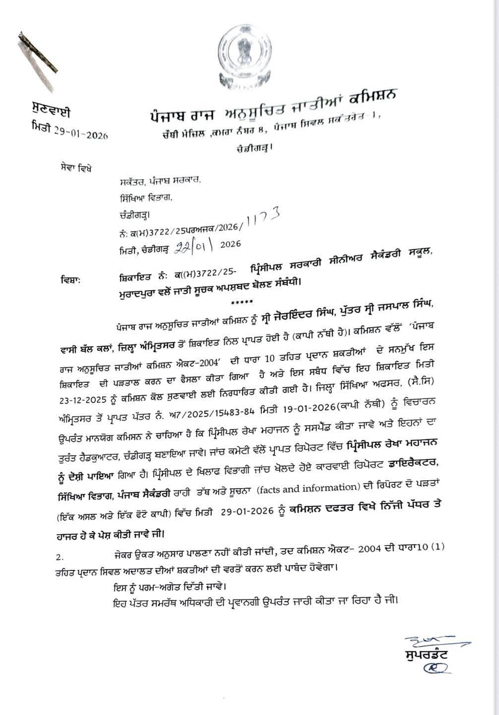 ਕਮਿਸ਼ਨ ਦੇ ਚੇਅਰਮੈਨ ਜਸਵੀਰ ਸਿੰਘ ਗੜੀ ਨੇ ਕੇਸ ਸਬੰਧੀ ਜਾਣਕਾਰੀ ਦਿੰਦਿਆਂ ਕਿਹਾ ਕਿ ਇਸ ਕੇਸ ਸਬੰਧੀ ਦੋ ਤਰੀਕਾਂ ਤੇ ਸੁਣਵਾਈ ਕਮਿਸ਼ਨ ਕੋਰਟ ਵਿੱਚ ਹੋਈ ਹੈ। ਮੁਢਲੀ ਜਾਂਚ ਦੌਰਾਨ ਹੀ ਪ੍ਰਿੰਸੀਪਲ ਰੇਖਾ ਮਹਾਜਨ ਦੋਸ਼ੀ ਪਾਈ ਗਈ ਸੀ, ਲੇਕਿਨ ਵਿਭਾਗੀ ਜਾਂਚ ਵਿੱਚ ਸਿੱਧ ਹੋ ਚੁੱਕਾ ਹੈ ਕਿ ਪ੍ਰਿੰਸੀਪਲ ਰੇਖਾ ਮਹਾਜਨ ਆਦਤਨ ਦੋਸ਼ੀ ਹੈ, ਇਸ ਲਈ ਵਿਭਾਗੀ ਕਾਰਵਾਈ ਲਈ ਲਿਖਿਆ ਗਿਆ ਹੈ। ਅਗਲੀਆਂ ਤਰੀਕਾਂ ਵਿੱਚ ਸੁਣਵਾਈ ਜਾਰੀ ਰਹੇਗੀ ਅਤੇ ਪੰਜਾਬ ਰਾਜ ਅਨੁਸੂਚਿਤ ਜਾਤੀਆਂ ਐਕਟ 1989 ਦੀ ਕਨੂੰਨੀ ਕਾਰਵਾਈ ਲਈ ਵੀ ਪੁਲਿਸ ਵਿਭਾਗ ਨੂੰ ਪਾਬੰਦ ਕੀਤਾ ਜਾਵੇਗਾ।