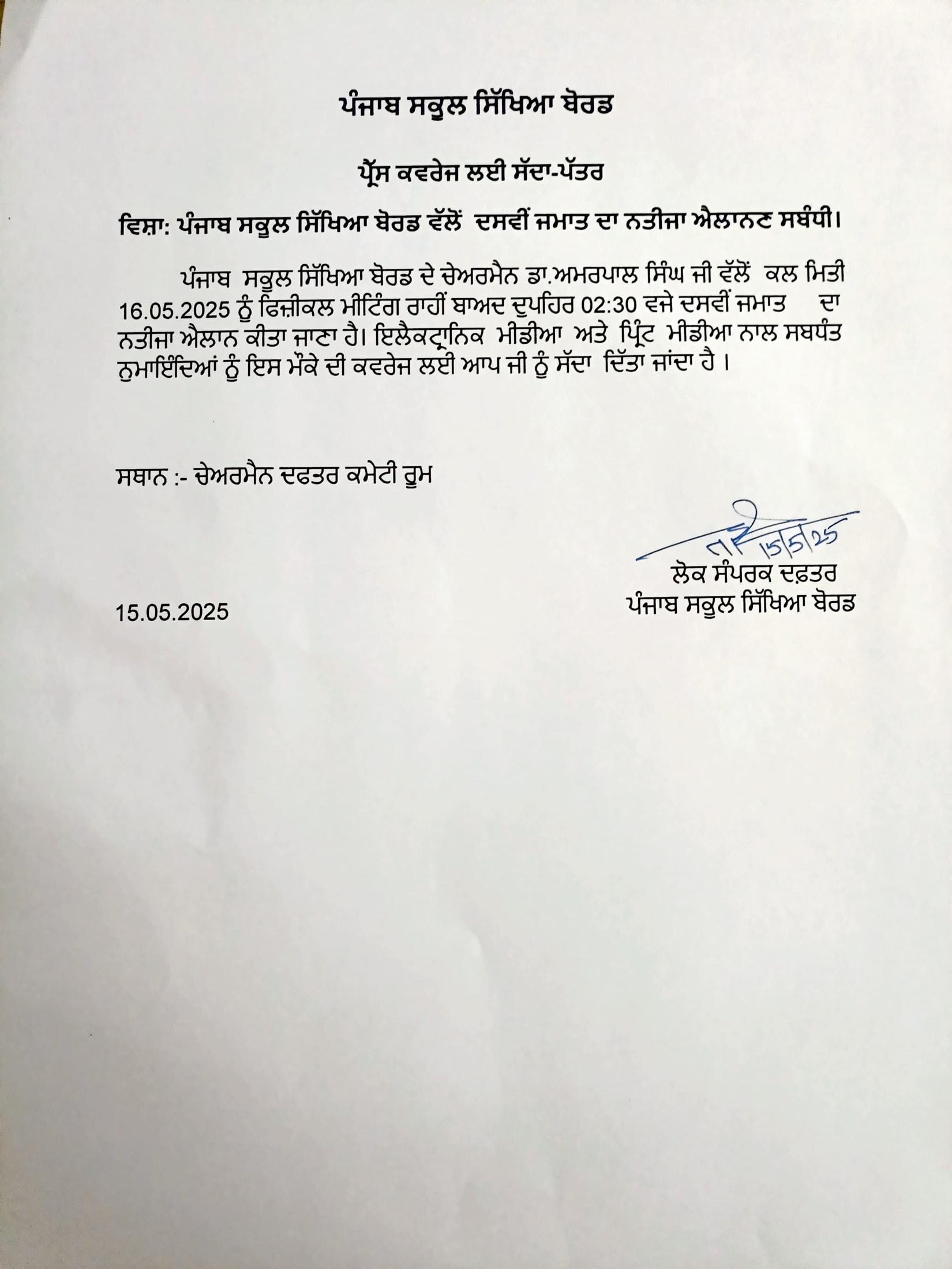 PSEB 10th Result New Update : ਪੰਜਾਬ ਸਕੂਲ ਸਿੱਖਿਆ ਬੋਰਡ ਵੱਲੋਂ ਕਿਹਾ ਗਿਆ ਹੈ ਕਿ 10ਵੀਂ ਜਮਾਤ ਦੇ ਨਤੀਜੇ ਭਲਕੇ ਐਲਾਨ ਕੀਤੇ ਜਾਣਗੇ। ਦੁਪਹਿਰ 2:30 ਵਜੇ ਤੱਕ ਮੈਰਿਟ ’ਚ ਆਉਣ ਵਾਲੇ ਬੱਚਿਆਂ ਦੀ ਲਿਸਟ ਜਾਰੀ ਕਰ ਦਿੱਤੀ ਜਾਵੇਗੀ।
