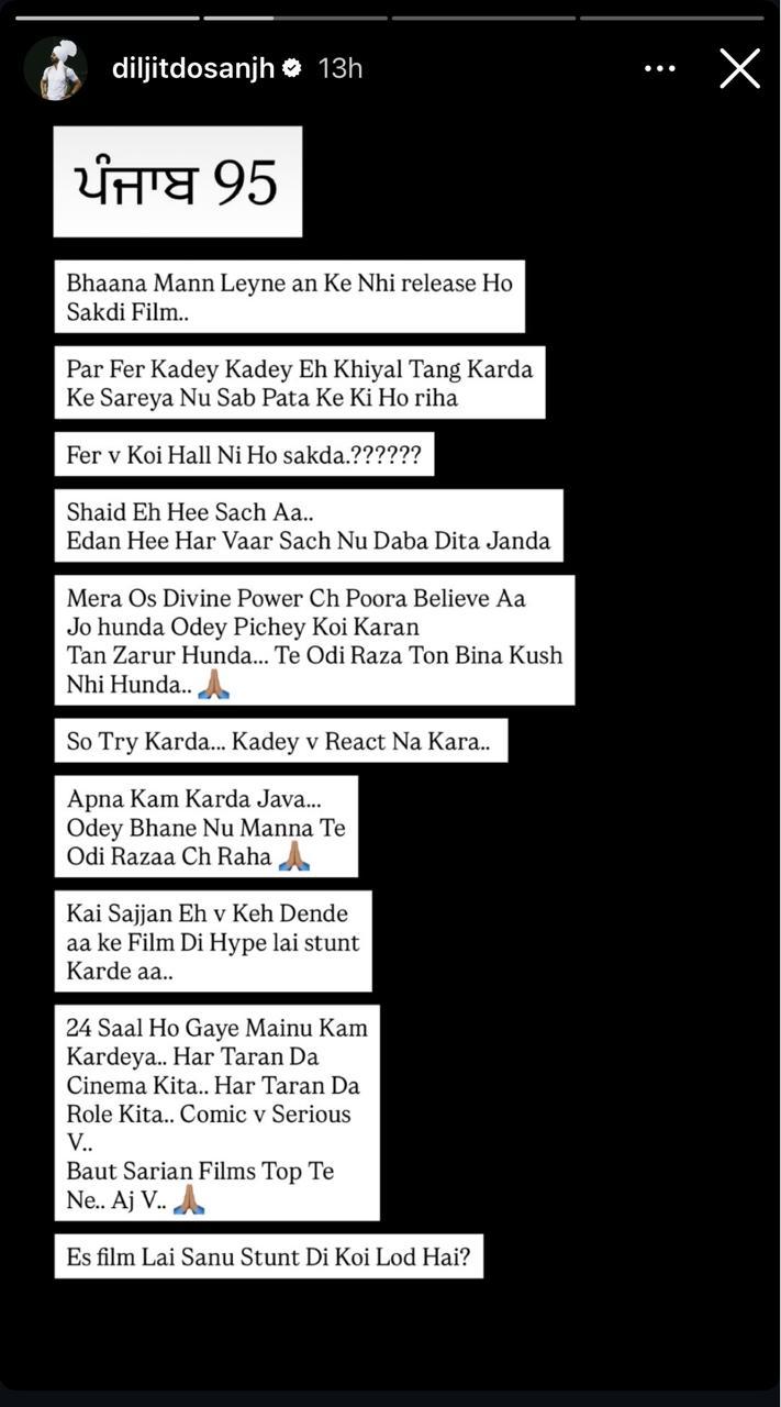 ਦਿਲਜੀਤ ਦੁਸਾਂਝ ਨੇ ਆਪਣੀ ਸੋਸ਼ਲ ਮੀਡੀਆ 'ਤੇ ਸਟੋਰੀ ਪੋਸਟ ਸਾਂਝੀ ਕਰਦੇ ਲਿਖਿਆ, ''ਭਾਣਾ ਮੰਨ ਲੈਨੇ ਆਂ ਕਿ ਨਹੀਂ ਰਿਲੀਜ਼ ਹੋ ਸਕਦੀ ਫਿਲਮ..ਪਿਰ ਫਿਰਕਦੇ ਕਦੇ ਇਹ ਖਿਆਲ ਤੰਗ ਕਰਦਾ ਕਿ ਸਾਰਿਆਂ ਨੂੰ ਸਭ ਪਤਾ ਕੇ ਕੀ ਹੋ ਰਿਹਾ, ਫਿਰ ਵੀ ਕੋਈ ਹੱਲ ਨਹੀਂ ਹੋ ਸਕਦਾ ????''