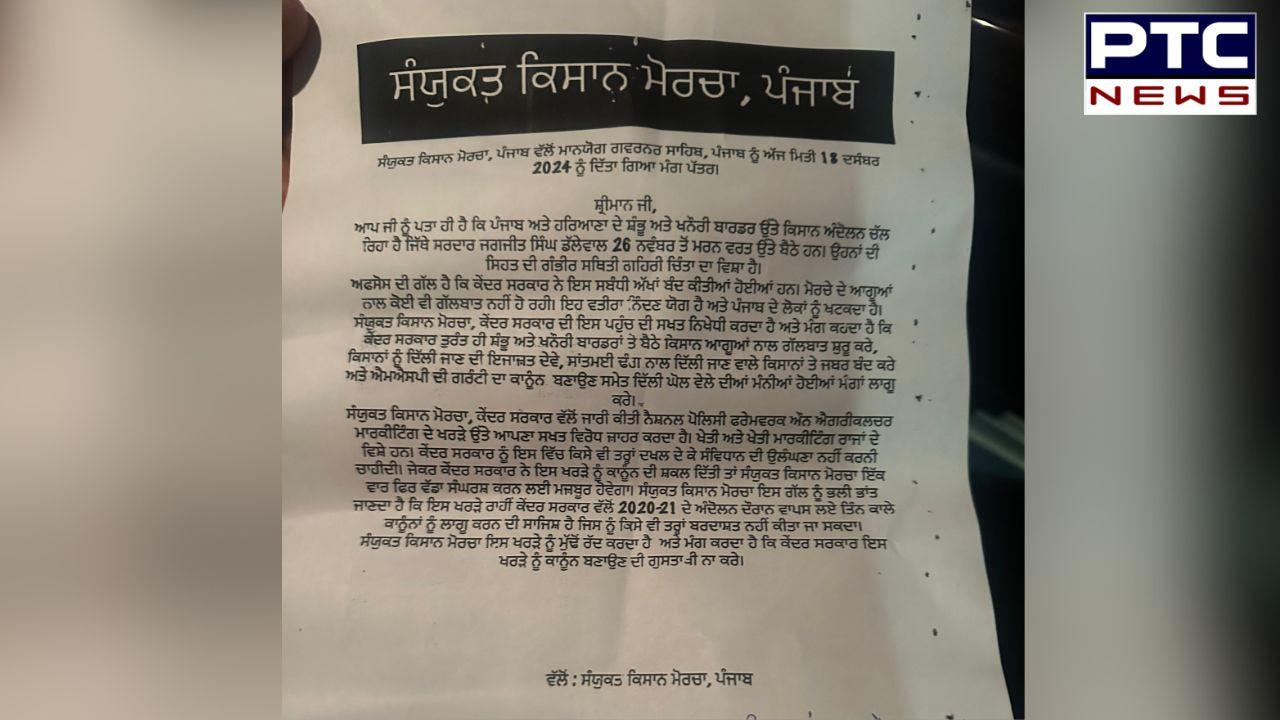 ਪੰਜਾਬ ਦੇ ਗਵਰਨਰ ਨੂੰ ਸੰਯੁਕਤ ਕਿਸਾਨ ਮੋਰਚੇ ਵੱਲੋਂ ਦਿੱਤਾ ਜਾਣ ਵਾਲਾ ਮੰਗ ਪੱਤਰ