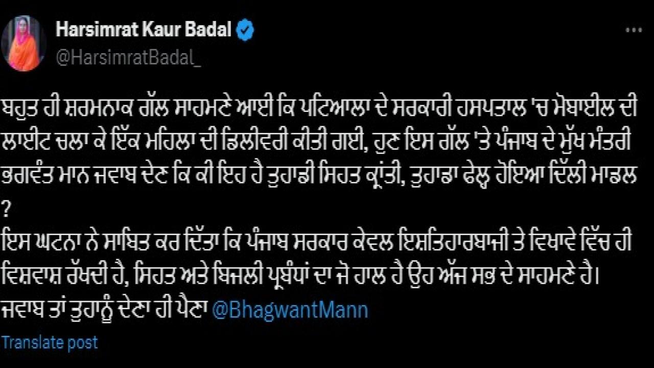 ਉਧਰ, ਇਸ ਮਾਮਲੇ ਨੂੰ ਲੈ ਕੇ ਸ਼੍ਰੋਮਣੀ ਅਕਾਲੀ ਦਲ ਦੀ ਬਠਿੰਡਾ ਤੋਂ ਮੈਂਬਰ ਪਾਰਲੀਮੈਂਟ ਹਰਸਿਮਰਤ ਕੌਰ ਬਾਦਲ ਨੇ ਮੁੱਖ ਮੰਤਰੀ ਭਗਵੰਤ ਮਾਨ ਦੀ ਸਰਕਾਰ 'ਤੇ ਸਵਾਲ ਖੜੇ ਕੀਤੇ ਹਨ। ਉਨ੍ਹਾਂ ਕਿਹਾ, ਇਹ ਬਹੁਤ ਹੀ ਸ਼ਰਮਨਾਕ ਗੱਲ ਸਾਹਮਣੇ ਆਈ ਕਿ ਪਟਿਆਲਾ ਦੇ ਸਰਕਾਰੀ ਹਸਪਤਾਲ 'ਚ ਮੋਬਾਈਲ ਦੀ ਲਾਈਟ ਚਲਾ ਕੇ ਇੱਕ ਮਹਿਲਾ ਦੀ ਡਿਲੀਵਰੀ ਕੀਤੀ ਗਈ, ਹੁਣ ਇਸ ਗੱਲ 'ਤੇ ਪੰਜਾਬ ਦੇ ਮੁੱਖ ਮੰਤਰੀ ਭਗਵੰਤ ਮਾਨ ਜਵਾਬ ਦੇਣ ਕਿ ਕੀ ਇਹ ਹੈ ਤੁਹਾਡੀ ਸਿਹਤ ਕ੍ਰਾਂਤੀ, ਤੁਹਾਡਾ ਫੇਲ੍ਹ ਹੋਇਆ ਦਿੱਲੀ ਮਾਡਲ ?''