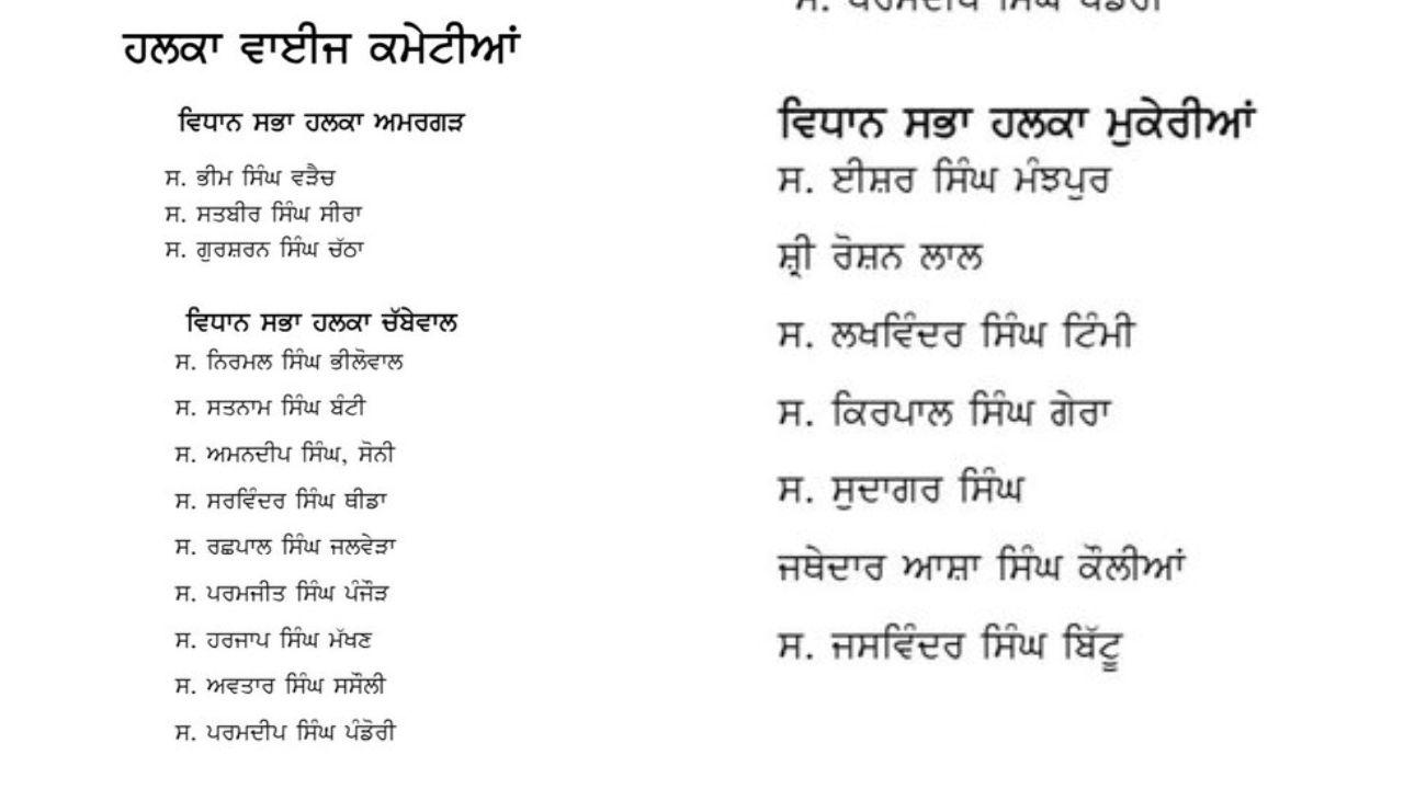 ਇਸ ਤੋਂ ਇਲਾਵਾ, ਸ਼੍ਰੋਮਣੀ ਅਕਾਲੀ ਦਲ ਦੇ ਪ੍ਰਧਾਨ ਨਾਲ ਹਲਕਿਆਂ ਦੇ ਪਾਰਟੀ ਆਗੂਆਂ ਅਤੇ ਵਰਕਰਾਂ ਨਾਲ ਵਿਸਥਾਰਤ ਵਿਚਾਰ-ਵਟਾਂਦਰੇ ਤੋਂ ਬਾਅਦ ਜ਼ਿਲ੍ਹਾ ਪ੍ਰੀਸ਼ਦ ਅਤੇ ਪੰਚਾਇਤ ਸੰਮਤੀ ਚੋਣਾਂ ਦੀ ਜਾਂਚ, ਚੋਣ ਅਤੇ ਆਯੋਜਨ ਲਈ ਨੱਥੀ ਸੂਚੀ ਅਨੁਸਾਰ ਵੱਖ-ਵੱਖ ਵਿਧਾਨ ਸਭਾ ਹਲਕਿਆਂ ਵਿੱਚ ਹਲਕਾ ਪੱਧਰੀ ਕਮੇਟੀਆਂ ਦਾ ਗਠਨ ਕੀਤਾ ਗਿਆ ਹੈ।
