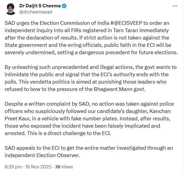 ਉਧਰ, ਸ਼੍ਰੋਮਣੀ ਅਕਾਲੀ ਦਲ ਨੇ ਤਰਨਤਾਰਨ ਜ਼ਿਮਨੀ ਚੋਣ 'ਚ ਦਰਜ ਸਾਰੀਆਂ ਐਫਆਈਆਰ ਨੂੰ ਲੈ ਕੇ ਮੁੱਖ ਚੋਣ ਕਮਿਸ਼ਨ ਦਾ ਰੁਖ਼ ਕੀਤਾ ਹੈ ਅਤੇ ਨਿਰਪੱਖ ਜਾਂਚ ਦੀ ਮੰਗ ਕੀਤੀ ਹੈ। ਪਾਰਟੀ ਦੇ ਸੀਨੀਅਰ ਆਗੂ ਤੇ ਬੁਲਾਰੇ ਡਾ. ਦਲਜੀਤ ਸਿੰਘ ਚੀਮਾ ਨੇ ਐਕਸ 'ਤੇ ਚੋਣ ਕਮਿਸ਼ਨ ਨੂੰ ਪੋਸਟ ਸਾਂਝੀ ਕਰਦੇ ਹੋਏ ਮੰਗ ਕੀਤੀ ਹੈ।