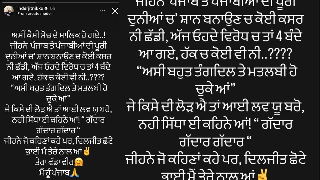ਇੰਦਰਜੀਤ ਨਿੱਕੂ ਨੇ ਪੋਸਟ ਸਾਂਝੀ ਕਰਦਿਆਂ ਲਿਖਿਆ, ''''ਅਸੀਂ ਕੈਸੀ ਸੋਚ ਦੇ ਮਾਲਿਕ ਹੋ ਗਏ..! ਜੀਹਨੇ ਪੰਜਾਬ ਤੇ ਪੰਜਾਬੀਆਂ ਦੀ ਪੂਰੀ ਦੁਨੀਆਂ 'ਚ ਸ਼ਾਨ ਬਣਾਉਣ ਚ ਕੋਈ ਕਸਰ ਨਹੀਂ ਛੱਡੀ, ਅੱਜ ਉਹਦੇ ਵਿਰੋਧ 'ਚ ਤਾਂ 4 ਬੰਦੇ ਆ ਗਏ, ਹੱਕ 'ਚ ਕੋਈ ਵੀ ਨੀ..???? “ਅਸੀਂ ਬਹੁਤ ਤੰਗਦਿਲ ਤੇ ਮਤਲਬੀ ਹੋ ਚੁੱਕੇ ਆਂ” ਜੇ ਕਿਸੇ ਦੀ ਲੋੜ ਐ ਤਾਂ ਆਪਣੀ ਲਵ ਪੂਰੀ ਬਚੋ, ਨਹੀਂ ਸਿੱਧਾ ਦੀ ਕਹਿਣੇ ਆਂ! “ਗੱਦਾਰ ਗੱਦਾਰ ਗੱਦਾਰ ” ਜੀਹਨੇ ਜੋ ਕਹਿਣਾਂ ਕਹੇ ਪਰ, ਦਿਲਜੀਤ ਭਾਈ ਮੈਂ ਤੇਰੇ ਨਾਲ ਆਂ, ਤੇਰਾ ਵੱਡਾ ਵੀਰ, ਮੈਂ ਹਾਂ ਪੰਜਾਬ।''