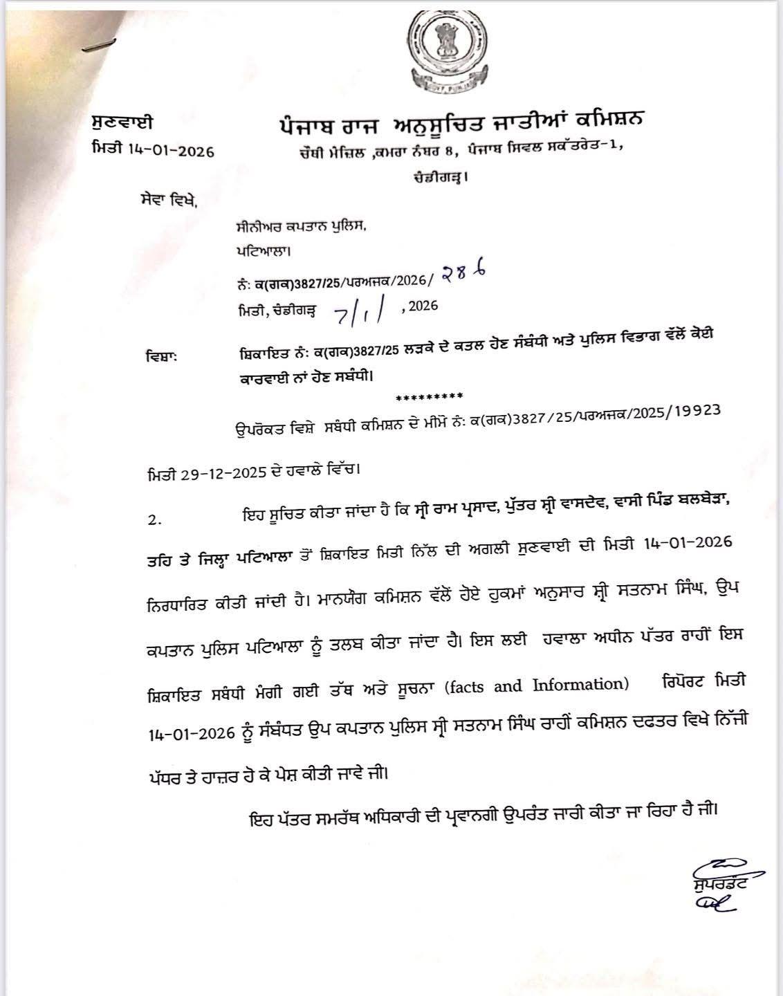 ਇਸੇ ਤਰ੍ਹਾਂ ਦੂਜੇ ਮਾਮਲੇ ਉਨ੍ਹਾਂ ਦੱਸਿਆ ਕਿ ਸੁਖਦੀਪ ਕੌਰ ਪਤਨੀ ਸੁਖਵਿੰਦਰ ਸਿੰਘ ਵਾਸੀ ਧਾਮੋ ਮਾਜਰਾ ਪਟਿਆਲਾ ਵਲੋਂ ਥਾਣੇਦਾਰ ਬਲਜੀਤ ਸਿੰਘ ਖਿਲਾਫ ਪੁਲਿਸ ਕੋਲ ਦਰਜ਼ ਮਾਮਲੇ ਵਿਚ ਪੰਜਾਬ ਰਾਜ ਅਨੁਸੂਚਿਤ ਜਾਤੀਆਂ ਕਮਿਸ਼ਨ ਦੀਆਂ ਹਦਾਇਤਾਂ ਦੇ ਬਾਵਜੂਦ ਕਾਰਵਾਈ ਅਮਲ ਵਿੱਚ ਨਾ ਲਿਆਉਣ ਦੇ ਮਾਮਲੇ ਵਿਚ ਪਟਿਆਲਾ ਜ਼ਿਲ੍ਹੇ ਦੇ ਪੰਜਾਬ ਬਿਊਰੋ ਆਫ਼ ਇਨਵੈਸਟੀਗੇਸ਼ਨ ਦੇ ਐਸ.ਪੀ. ਸਵਰਨਜੀਤ ਕੌਰ ਨੂੰ 14 ਜਨਵਰੀ 2026 ਨੂੰ ਤਲਬ ਕੀਤਾ ਹੈ।