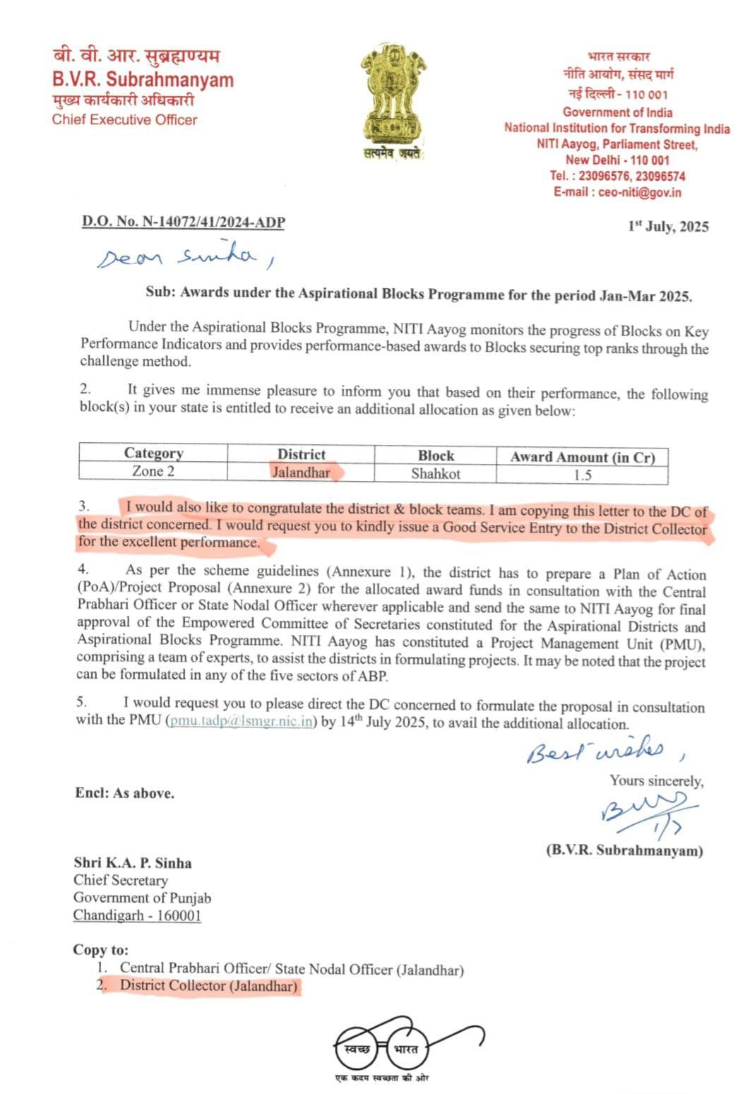 ਇਹ ਜਾਣਕਾਰੀ ਨੀਤੀ ਆਯੋਗ ਦੇ ਮੁੱਖ ਕਾਰਜਕਾਰੀ ਅਧਿਕਾਰੀ ਬੀ.ਵੀ.ਆਰ. ਸੁਬ੍ਰਹਮਣੀਅਮ ਨੇ ਇੱਕ ਅਧਿਕਾਰਤ ਪੱਤਰ ਰਾਹੀਂ ਦਿੱਤੀ। ਇਸ ਸ਼ਾਨਦਾਰ ਪ੍ਰਦਰਸ਼ਨ ਲਈ ਨੀਤੀ ਆਯੋਗ ਵੱਲੋਂ ਜਲੰਧਰ ਜ਼ਿਲ੍ਹੇ ਨੂੰ ₹1.5 ਕਰੋੜ ਦੀ ਰਾਸ਼ੀ ਦਾ ਵੀ ਐਲਾਨ ਕੀਤਾ ਗਿਆ ਹੈ।