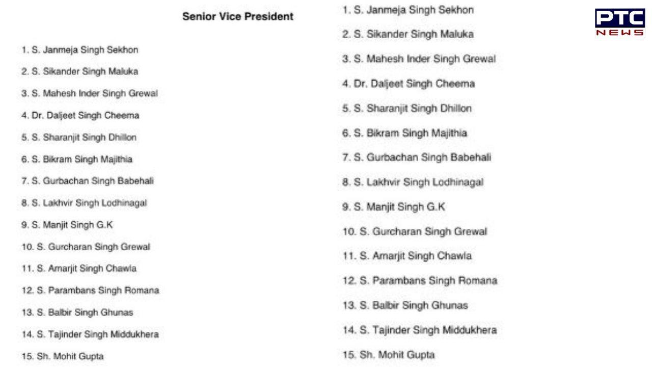 ਇਸ ਸੂਚੀ ਰਾਹੀਂ ਜਿਨ੍ਹਾਂ ਨੂੰ ਸੀਨੀਅਰ ਮੀਤ ਪ੍ਰਧਾਨ ਦੇ ਅਹੁਦੇ ਨਾਲ ਨਿਵਾਜਿਆ ਗਿਆ ਹੈ, ਉਨ੍ਹਾਂ ਵਿੱਚ ਜਨਮੇਜਾ ਸਿੰਘ ਸੇਖੋਂ, ਸਿਕੰਦਰ ਸਿੰਘ ਮਲੂਕਾ, ਮਹੇਸ਼ਇੰਦਰ ਸਿੰਘ ਗਰੇਵਾਲ, ਡਾ. ਦਲਜੀਤ ਸਿੰਘ ਚੀਮਾ, ਸ਼ਰਨਜੀਤ ਸਿੰਘ ਢਿੱਲੋਂ, ਬਿਕਰਮ ਸਿੰਘ ਮਜੀਠੀਆ, ਗੁਰਬਚਨ ਸਿੰਘ ਬੱਬੇਹਾਲੀ, ਲਖਵੀਰ ਸਿੰਘ ਲੋਧੀਨੰਗਲ, ਮਨਜੀਤ ਸਿੰਘ ਜੀ.ਕੇ., ਗੁਰਚਰਨ ਸਿੰਘ ਗਰੇਵਾਲ, ਅਮਰਜੀਤ ਸਿੰਘ ਚਾਵਲਾ, ਪਰਮਬੰਸ ਸਿੰਘ ਰੋਮਾਣਾ, ਬਲਬੀਰ ਸਿੰਘ ਘੁੰਨਸ, ਤੇਜਿੰਦਰ ਸਿੰਘ ਮਿੱਡੂਖੇੜਾ ਅਤੇ ਮੋਹਿਤ ਗੁਪਤਾ ਸ਼ਾਮਲ ਹਨ।