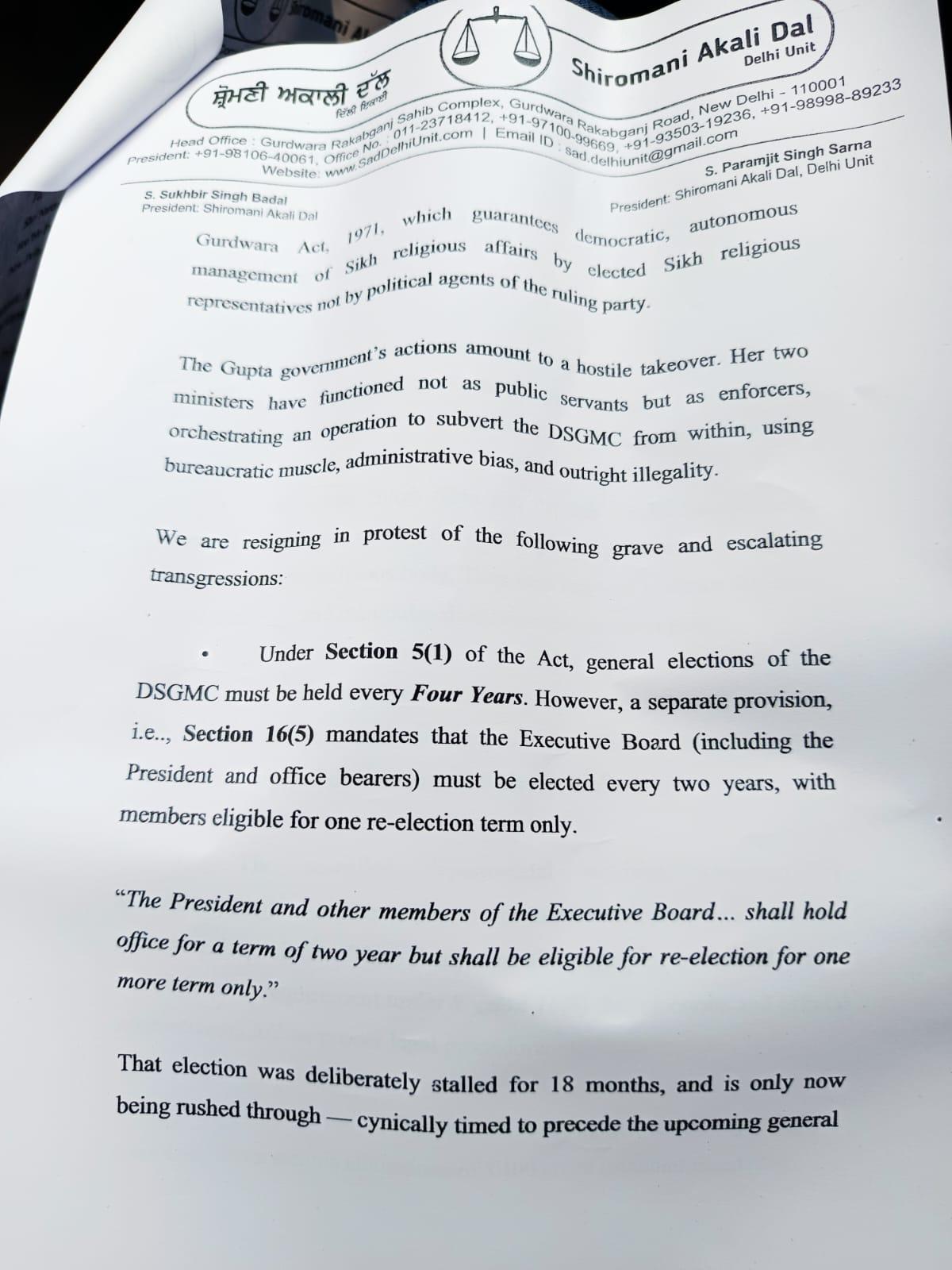 ਜਾਣਕਾਰੀ ਅਨੁਸਾਰ ਸ਼੍ਰੋਮਣੀ ਅਕਾਲੀ ਦਲ ਦੀ ਦਿੱਲੀ ਇਕਾਈ ਦੇ ਸੀਨੀਅਰ ਆਗੂ ਪਰਮਜੀਤ ਸਿੰਘ ਸਰਨਾ ਅਤੇ ਮਨਜੀਤ ਸਿੰਘ ਜੀਕੇ ਨੇ ਅਸਤੀਫੇ ਪ੍ਰਧਾਨ ਮੰਤਰੀ ਦਫਤਰ 'ਚ ਜਾ ਕੇ ਸੌਂਪੇ ਗਏ ਹਨ। ਦੋਹਾਂ ਆਗੂਆਂ ਵੱਲੋਂ ਪੱਤਰ ਵਿੱਚ ਕਿਹਾ ਗਿਆ ਹੈ ਕਿ ਦਿੱਲੀ ਸਰਕਾਰ, ਖਾਸ ਕਰਕੇ ਮੰਤਰੀ ਰੇਖਾ ਗੁਪਤਾ ਅਤੇ ਹੋਰ ਭਾਜਪਾ ਆਗੂਆਂ ਵੱਲੋਂ DSGMC ਵਿੱਚ ਰਾਜਨੀਤਿਕ ਦਖਲਅੰਦਾਜ਼ੀ ਕੀਤੀ ਜਾ ਰਹੀ ਹੈ। ਪੱਤਰ ਵਿੱਚ ਇਲਜ਼ਾਮ ਲਗਾਏ ਗਏ ਹਨ ਕਿ ਚੁਣੇ ਹੋਏ ਮੈਂਬਰਾਂ ਨੂੰ ਬਿਨਾਂ ਕਿਸੇ ਕਾਨੂੰਨੀ ਪ੍ਰਕਿਰਿਆ ਦੇ ਹਟਾ ਦਿੱਤਾ ਗਿਆ ਸੀ ਅਤੇ ਉਨ੍ਹਾਂ ਦੀ ਜਗ੍ਹਾ ਰਾਜਨੀਤਿਕ ਵਫ਼ਾਦਾਰਾਂ ਨੂੰ ਨਿਯੁਕਤ ਕੀਤਾ ਗਿਆ ਸੀ।