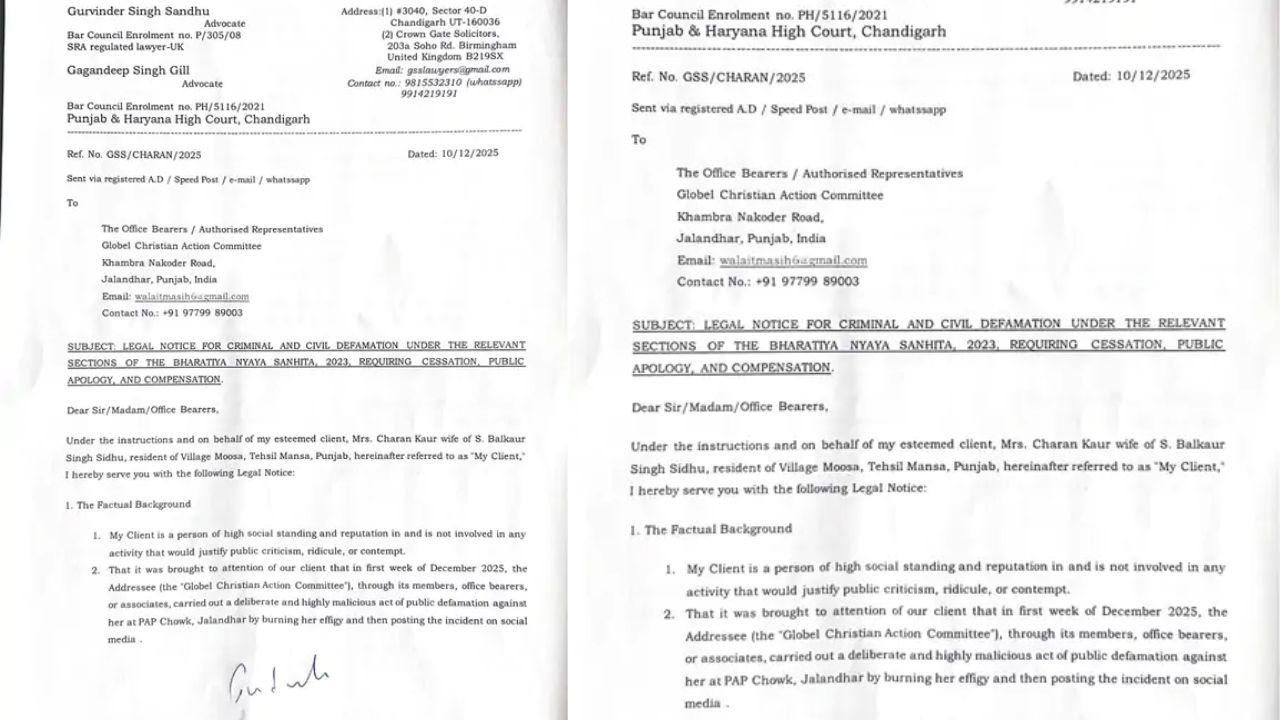 Sidhu Moosewala Mother : ਜਲੰਧਰ ਵਿੱਚ ਸਿੱਧੂ ਮੂਸੇਵਾਲਾ ਦੀ ਮਾਂ ਚਰਨ ਕੌਰ ਦੇ ਪੁਤਲੇ ਨੂੰ ਸਾੜਨ ਦੇ ਮਾਮਲੇ ਵਿੱਚ ਇੱਕ ਨਵਾਂ ਮੋੜ ਆਇਆ ਹੈ। ਸਿੱਧੂ ਦੀ ਮਾਂ ਨੇ ਆਪਣੇ ਵਕੀਲ ਰਾਹੀਂ ਕ੍ਰਿਸ਼ਚੀਅਨ ਗਲੋਬਲ ਐਕਸ਼ਨ ਕਮੇਟੀ ਨੂੰ 10 ਲੱਖ ਰੁਪਏ ਦਾ ਕਾਨੂੰਨੀ ਨੋਟਿਸ ਭੇਜਿਆ ਹੈ। ਸਿੱਧੂ ਦੇ ਪਰਿਵਾਰ ਦੀ ਨੁਮਾਇੰਦਗੀ ਕਰ ਰਹੇ ਵਕੀਲ ਗੁਰਵਿੰਦਰ ਸੰਧੂ ਨੇ ਨੋਟਿਸ ਵਿੱਚ ਪੁੱਛਿਆ ਹੈ ਕਿ ਇਹ ਕਿਸ ਦੇ ਨਿਰਦੇਸ਼ਾਂ 'ਤੇ ਕੀਤਾ ਗਿਆ ਸੀ।