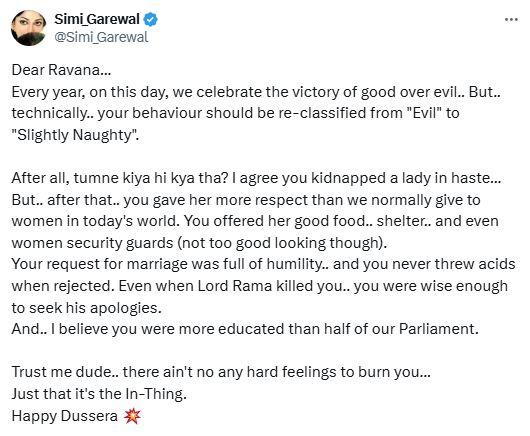 Ravana Not Evil, Slightly Naughty : ਸਿੰਮੀ ਨੇ ਵੀਰਵਾਰ ਨੂੰ ਆਪਣੇ ਐਕਸ (ਪਹਿਲਾਂ ਟਵਿੱਟਰ) ਹੈਂਡਲ 'ਤੇ ਰਾਵਣ ਦੀ ਪ੍ਰਸ਼ੰਸਾ ਕਰਦੇ ਹੋਏ ਇੱਕ ਲੰਮਾ ਨੋਟ ਲਿਖਿਆ, ਜੋ ਕਿ ਦੁਸਹਿਰੇ 'ਤੇ ਰਵਾਇਤੀ ਤੌਰ 'ਤੇ ਬੁਰਾਈ 'ਤੇ ਚੰਗਿਆਈ ਦੀ ਜਿੱਤ ਨੂੰ ਦਰਸਾਉਣ ਲਈ ਪੁਤਲਾ ਸਾੜਿਆ ਜਾਂਦਾ ਹੈ।
