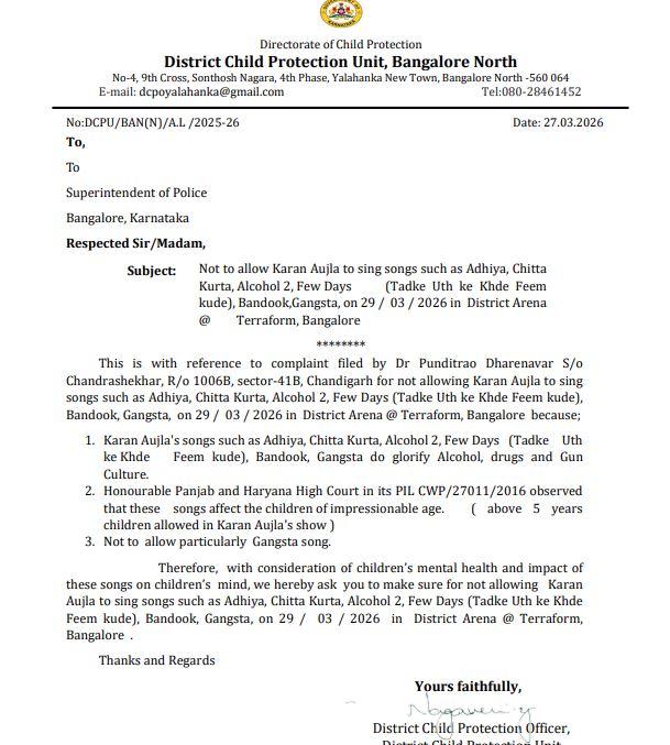 Karan Aujla Bengaluru show : ਪੰਜਾਬੀ ਗਾਇਕ ਕਰਨ ਔਜਲਾ ਦਾ ਅੱਜ ਬੰਗਲੌਰ 'ਚ ਸ਼ੋਅ ਹੈ, ਪਰ ਇਸਤੋਂ ਪਹਿਲਾਂ ਹੀ ਗਾਇਕ ਨੂੰ ਇੱਕ ਨੋਟਿਸ ਜਾਰੀ ਹੋ ਗਿਆ ਹੈ। ਇਹ ਨੋਟਿਸ ਸ਼ੋਅ ਦੌਰਾਨ ਉਸ ਦੇ ਕੁੱਝ ਹਿੱਟ ਗੀਤ ਨਾ ਗਾਉਣ ਲਈ ਜਾਰੀ ਕੀਤਾ ਗਿਆ ਹੈ, ਤਾਂ ਜੋ ਬੱਚਿਆਂ ਉਪਰ ਬੁਰਾ ਪ੍ਰਭਾਵ ਨਾ ਪਵੇ। ਬੰਗਲੌਰ ਚਾਈਲਡ ਪ੍ਰੋਟੈਕਸ਼ਨ ਯੂਨਿਟ ਨੇ ਇਹ ਨੋਟਿਸ ਔਜਲਾ ਨੂੰ ਪ੍ਰੋ. ਪੰਡਿਤ ਧਰੇਨਵਰ ਰਾਓ (Prof. Pandit Dharenwar Rao) ਦੀ ਸ਼ਿਕਾਇਤ 'ਤੇ ਜਾਰੀ ਕੀਤਾ ਹੈ।