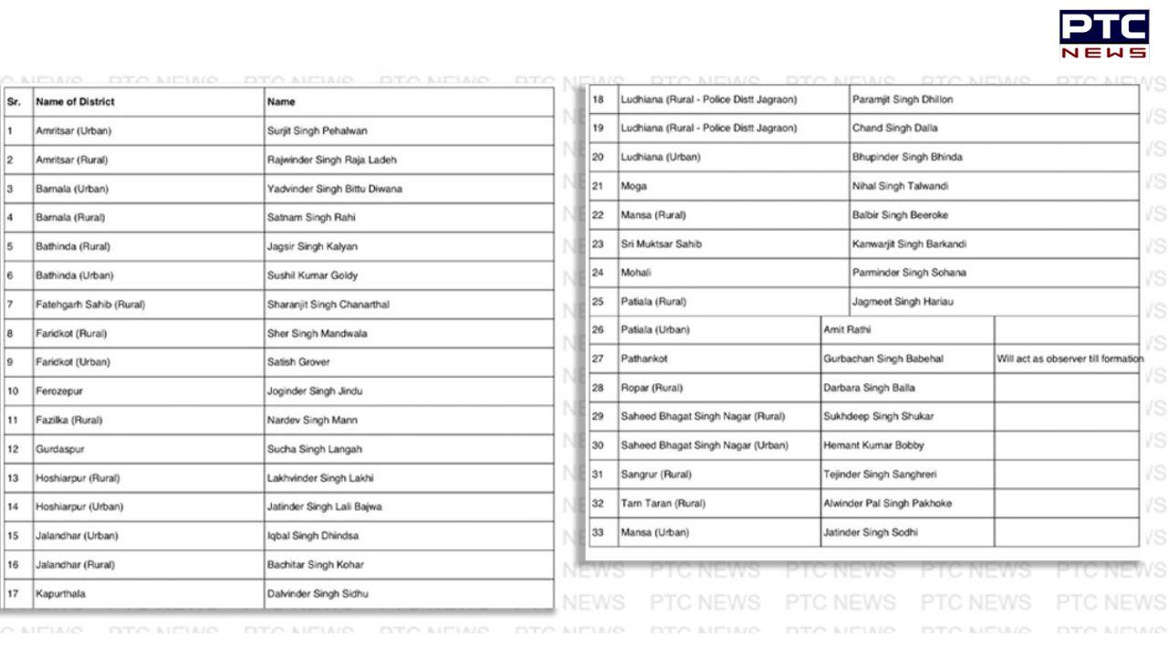 ਅੰਮ੍ਰਿਤਸਰ ਸ਼ਹਿਰੀ ਸੁਰਜੀਤ ਸਿੰਘ ਪਹਿਲਵਾਨ, ਅੰਮ੍ਰਿਤਸਰ ਦਿਹਾਤੀ ਰਾਜਵਿੰਦਰ ਸਿੰਘ ਰਾਜਾ ਲਾਦੇਹ, ਬਰਨਾਲਾ ਸ਼ਹਿਰੀ ਯਾਦਵਿੰਦਰ ਸਿੰਘ ਬਿੱਟੂ ਦੀਵਾਨਾ, ਬਰਨਾਲਾ ਦਿਹਾਤੀ ਸਤਨਾਮ ਸਿੰਘ ਰਾਹੀ, ਬਠਿੰਡਾ ਦਿਹਾਤੀ ਜਗਸੀਰ ਸਿੰਘ ਕਲਿਆਣ, ਬਠਿੰਡਾ ਸ਼ਹਿਰੀ ਸੁਸ਼ੀਲ ਕੁਮਾਰ ਗੋਲਡੀ, ਫਤਿਹਗੜ੍ਹ ਸਾਹਿਬ ਦਿਹਾਤੀ ਸ਼ਰਨਜੀਤ ਸਿੰਘ ਚਰਨਾਰਥਲ, ਫਰੀਦਕੋਟ ਦਿਹਾਤੀ ਸ਼ੇਰ ਸਿੰਘ ਮੰਡਵਾਲਾ, ਫਰੀਦਕੋਟ ਸ਼ਹਿਰੀ ਸਤੀਸ਼ ਗਰੋਵਰ, ਫਿਰੋਜ਼ਪੁਰ ਜੋਗਿੰਦਰ ਸਿੰਘ ਜਿੰਦੂ, ਫਾਜ਼ਿਲਕਾ ਦਿਹਾਤੀ ਨਰਦੇਵ ਸਿੰਘ ਮਾਨ, ਗੁਰਦਾਸਪੁਰ ਸੁੱਚਾ ਸਿੰਘ ਲੰਗਾਹ, ਹੁਸ਼ਿਆਰਪੁਰ ਦਿਹਾਤੀ ਲਖਵਿੰਦਰ ਸਿੰਘ ਲੱਖੀ, ਹੁਸ਼ਿਆਰਪੁਰ ਸ਼ਹਿਰੀ ਜਤਿੰਦਰ ਸਿੰਘ ਲਾਲੀ ਬਾਜਵਾ, ਜਲੰਧਰ ਸ਼ਹਿਰੀ ਇਕਬਾਲ ਸਿੰਘ ਬਾਜਵਾ, ਜਲੰਧਰ ਦਿਹਾਤੀ ਬਚਿੱਤਰ ਸਿੰਘ ਕੋਹਾੜ, ਕਪੂਰਥਲਾ ਦਲਵਿੰਦਰ ਸਿੰਘ ਸਿੱਧੂ, ਲੁਧਿਆਣਾ ਦਿਹਾਤੀ-ਪੁਲਿਸ ਜ਼ਿਲ੍ਹਾ ਖੰਨਾ ਪਰਮਜੀਤ ਸਿੰਘ ਢਿੱਲੋਂ, ਲੁਧਿਆਣਾ ਦਿਹਾਤੀ-ਪੁਲਿਸ ਜ਼ਿਲ੍ਹਾ ਜਗਰਾਓਂ-ਚੰਦ ਸਿੰਘ ਡੱਲਾ, ਲੁਧਿਆਣਾ ਸ਼ਹਿਰੀ-ਭੁਪਿੰਦਰ ਸਿੰਘ ਭਿੰਦਾ, ਮੋਗਾ ਨਿਹਾਲ ਸਿੰਘ ਤਲਵੰਡੀ, ਮਾਨਸਾ (ਦਿਹਾਤੀ) ਬਲਬੀਰ ਸਿੰਘ ਬੀਰੋਕੇ, ਸ੍ਰੀ ਮੁਕਤਸਰ ਸਾਹਿਬ ਕੰਵਰਜੀਤ ਸਿੰਘ ਬਰਕੰਦੀ, ਮੁਹਾਲੀ ਪਰਮਿੰਦਰ ਸਿੰਘ ਸੋਹਾਣਾ, ਪਟਿਆਲਾ ਦਿਹਾਤੀ ਜਗਮੀਤ ਸਿੰਘ ਹਰਿਆਊ, ਪਟਿਆਲਾ ਸ਼ਹਿਰੀ ਤੋਂ ਅਮਿਤ ਰਾਠੀ, ਪਠਾਨਕੋਟ ਤੋਂ ਗੁਰਬਚਨ ਸਿੰਘ ਬੱਲੇਹਾਲੀ, ਰੋਪੜ ਦਿਹਾਤੀ ਤੋਂ ਦਰਬਾਰਾ ਸਿੰਘ ਬੱਲਾ, ਸ਼ਹੀਦ ਭਗਤ ਸਿੰਘ ਨਗਰ ਦਿਹਾਤੀ ਤੋਂ ਸੁਖਦੀਪ ਸਿੰਘ ਸੁਕਾਰ, ਸ਼ਹੀਦ ਭਗਤ ਸਿੰਘ ਨਗਰ ਸ਼ਹਿਰੀ ਤੋਂ ਹੇਮੰਤ ਕੁਮਾਰ ਬੌਬੀ, ਸੰਗਰੂਰ ਦਿਹਾਤੀ ਤੋਂ ਤੇਜਿੰਦਰ ਸਿੰਘ ਸੰਘਰੇੜੀ, ਤਰਨਤਾਰਨ ਦਿਹਾਤੀ ਤੋਂ ਅਲਵਿੰਦਰਪਾਲ ਸਿੰਘ ਪੱਖੋਕੇ ਅਤੇ ਮਾਨਸਾ ਸ਼ਹਿਰੀ ਤੋਂ ਜਤਿੰਦਰ ਸਿੰਘ ਸੋਢੀ ਸ਼ਾਮਲ ਹਨ।