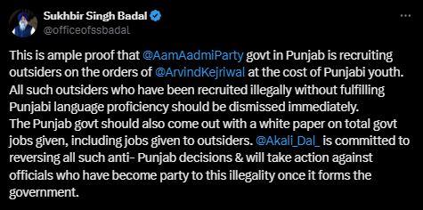 - ਪੰਜਾਬ ਸਰਕਾਰ ਨੂੰ ਇਹ ਵੀ ਦੱਸਣਾ ਚਾਹੀਦਾ ਹੈ ਕਿ ਕੁੱਲ ਕਿੰਨੀਆਂ ਸਰਕਾਰੀ ਨੌਕਰੀਆਂ ਦਿੱਤੀਆਂ ਗਈਆਂ ਸਨ ਅਤੇ ਉਨ੍ਹਾਂ ਵਿੱਚੋਂ ਕਿੰਨੀਆਂ ਬਾਹਰੀ ਲੋਕਾਂ ਨੂੰ ਦਿੱਤੀਆਂ ਗਈਆਂ ਸਨ। ਅਕਾਲੀ ਦਲ ਅਜਿਹੇ ਸਾਰੇ ਪੰਜਾਬ ਵਿਰੋਧੀ ਫੈਸਲਿਆਂ ਨੂੰ ਉਲਟਾਉਣ ਲਈ ਵਚਨਬੱਧ ਹੈ ਅਤੇ ਸਰਕਾਰ ਬਣਨ 'ਤੇ ਇਸ ਗੈਰ-ਕਾਨੂੰਨੀ ਕੰਮ ਵਿੱਚ ਸ਼ਾਮਲ ਅਧਿਕਾਰੀਆਂ ਵਿਰੁੱਧ ਕਾਰਵਾਈ ਕੀਤੀ ਜਾਵੇਗੀ।